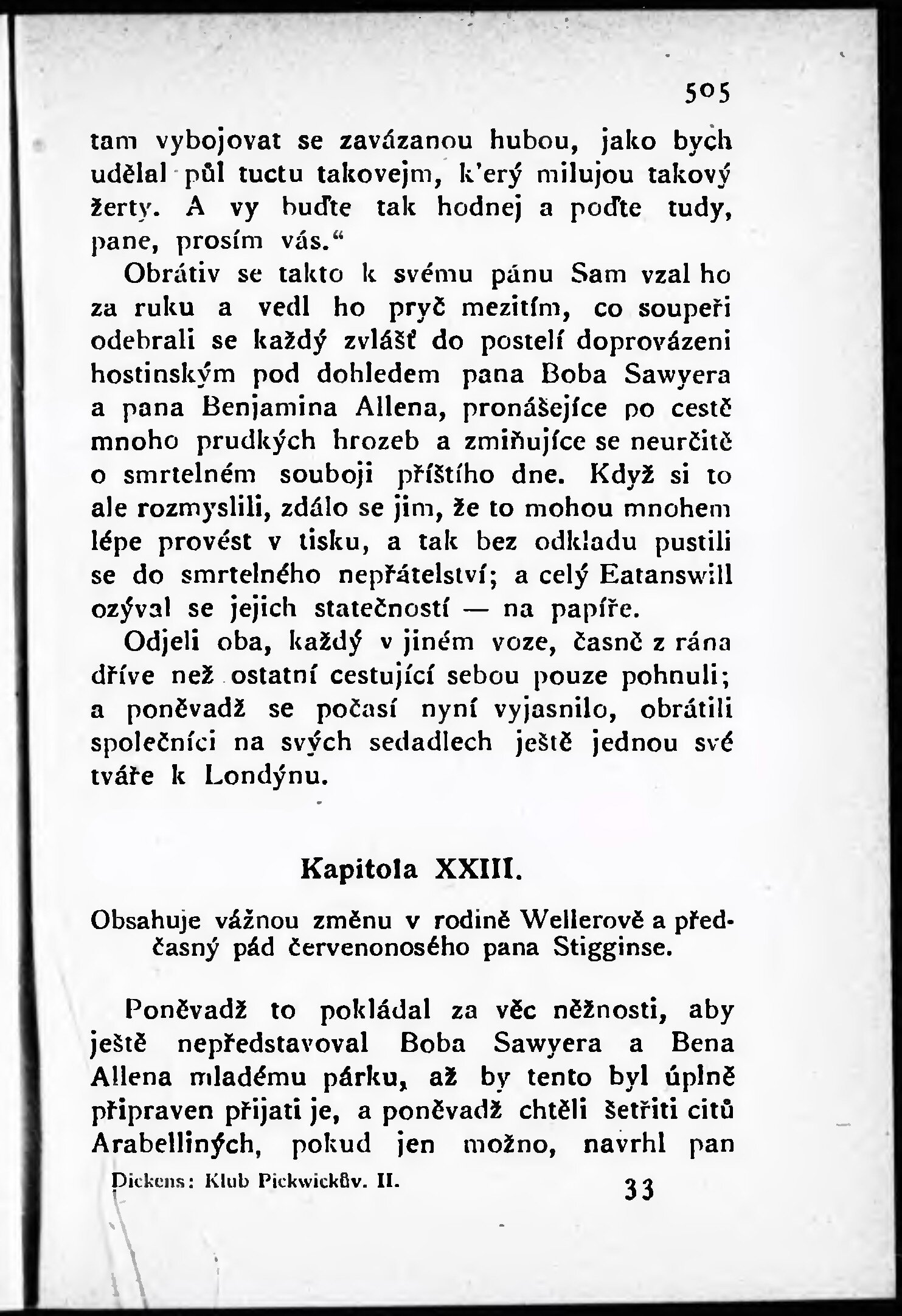 Obsahuje vážnou změnu v rodině Wellerově a předčasný pád červenonosého pana Stigginse