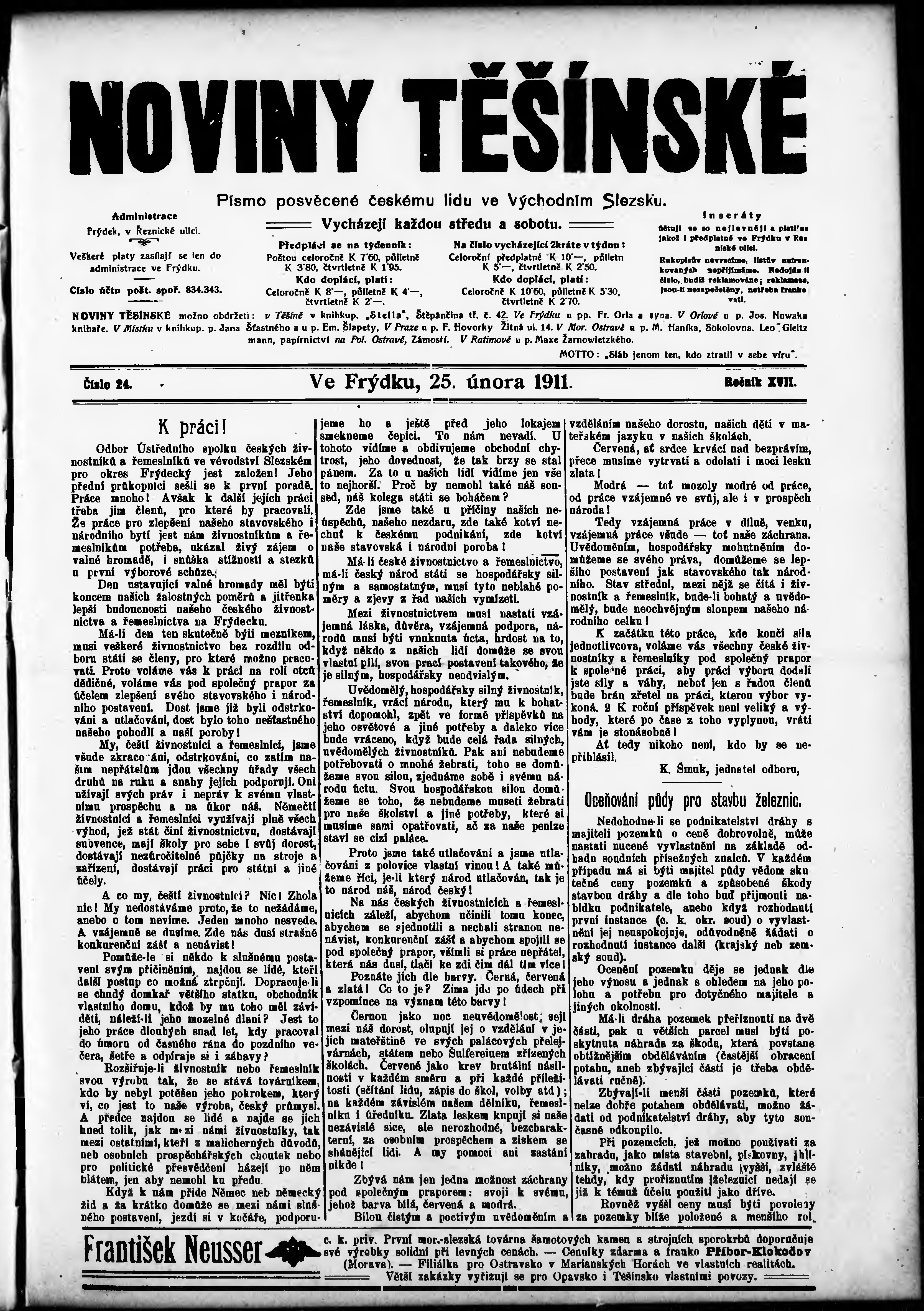 * Datum vydání výtisku: 25.2.1911 Číslo výtisku: 24