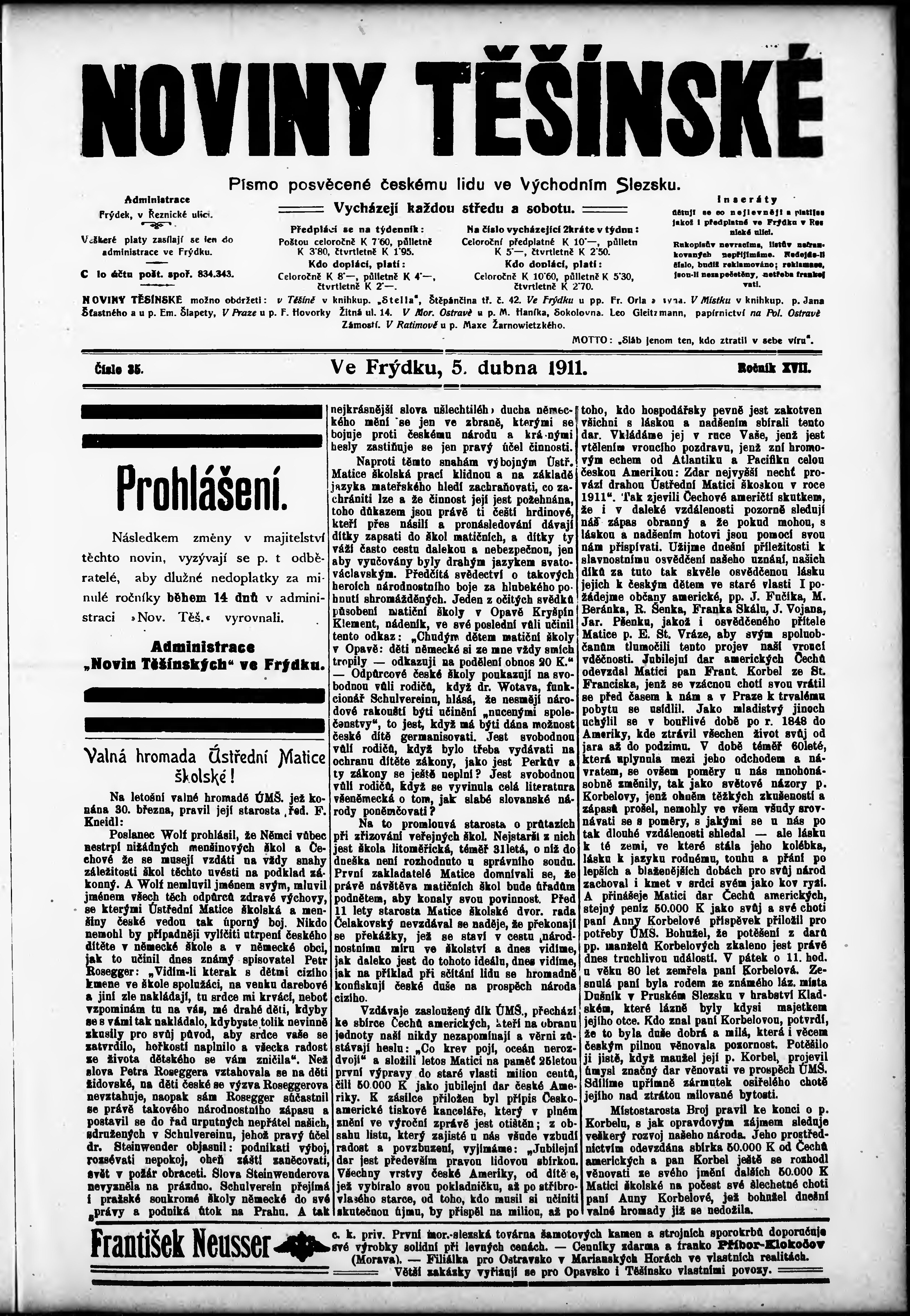 * Datum vydání výtisku: 5.4.1911 Číslo výtisku: 35