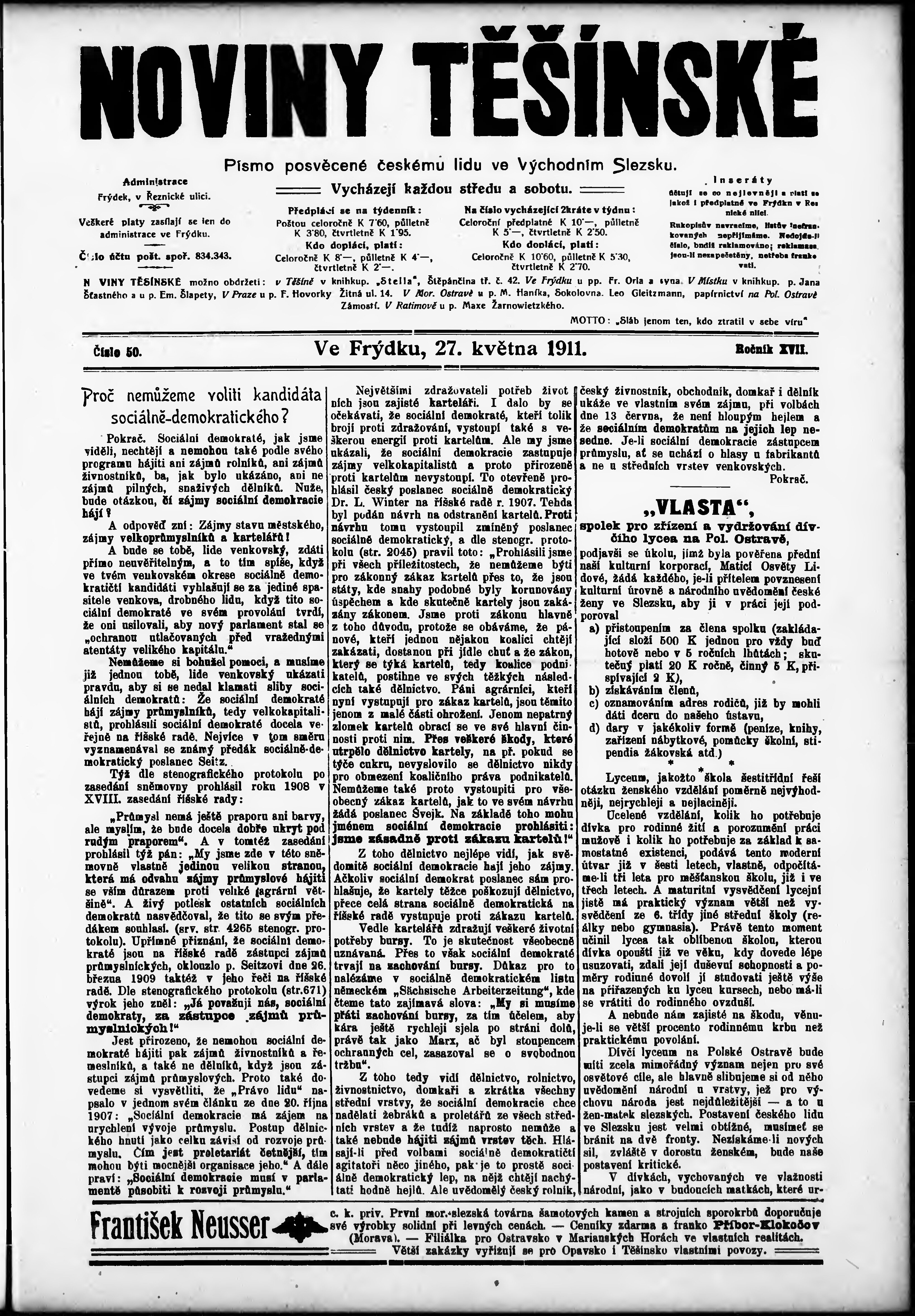 * Datum vydání výtisku: 27.5.1911 Číslo výtisku: 50