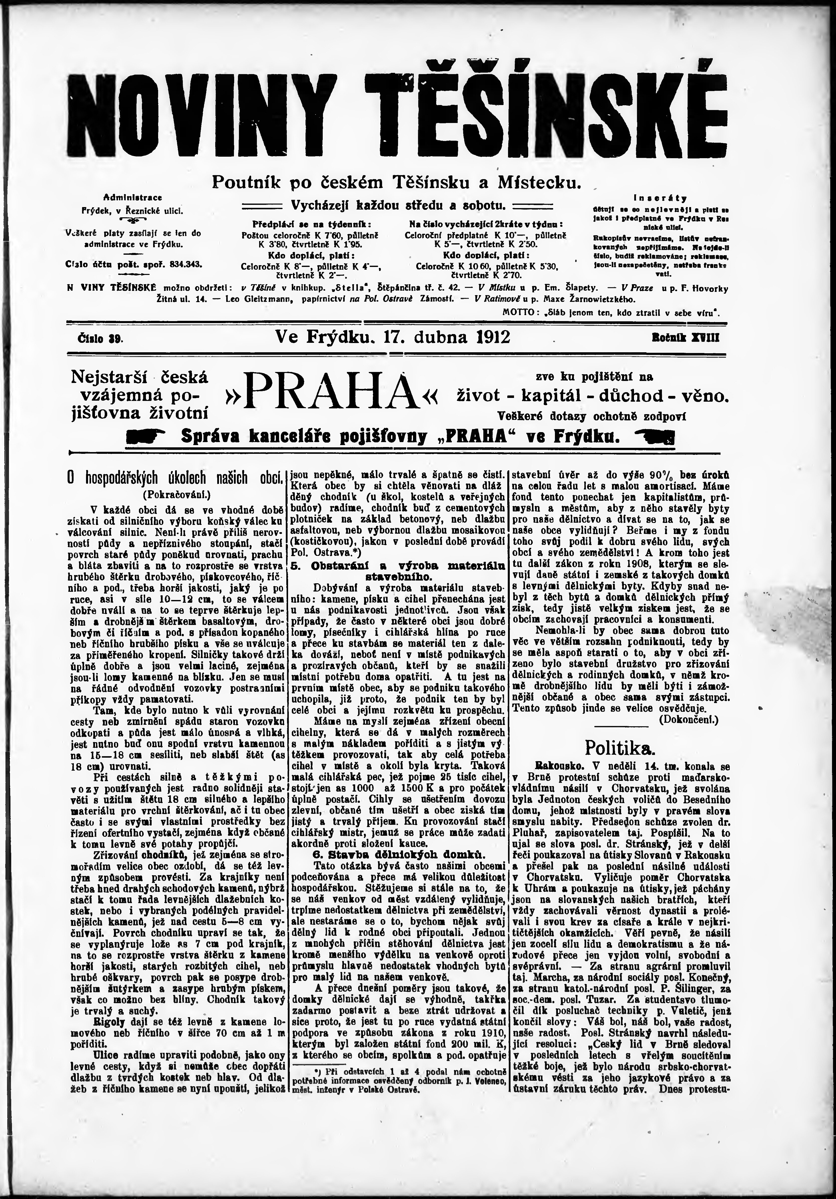 * Datum vydání výtisku: 17.4.1912 Číslo výtisku: 39