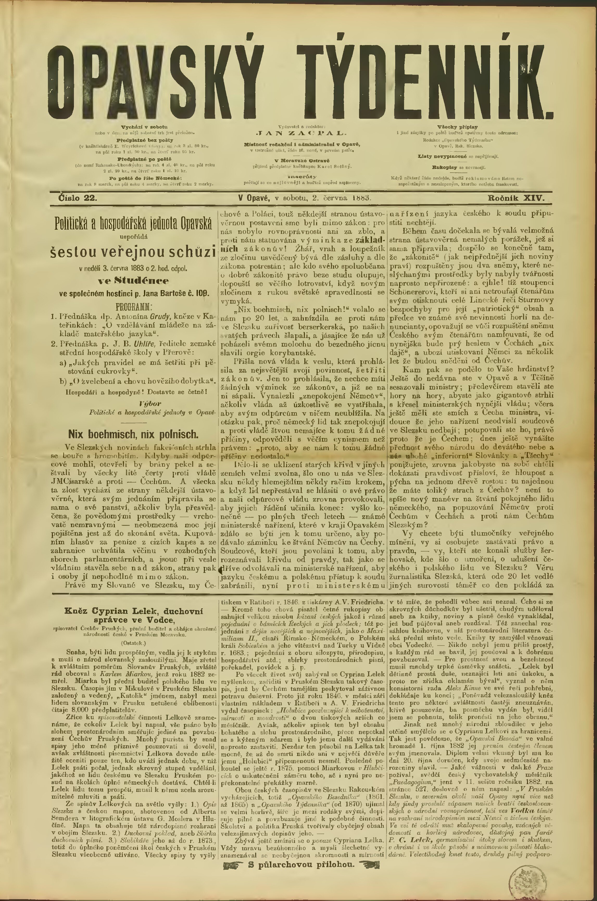 * Datum vydání výtisku: 2.6.1883 Číslo výtisku: 22
