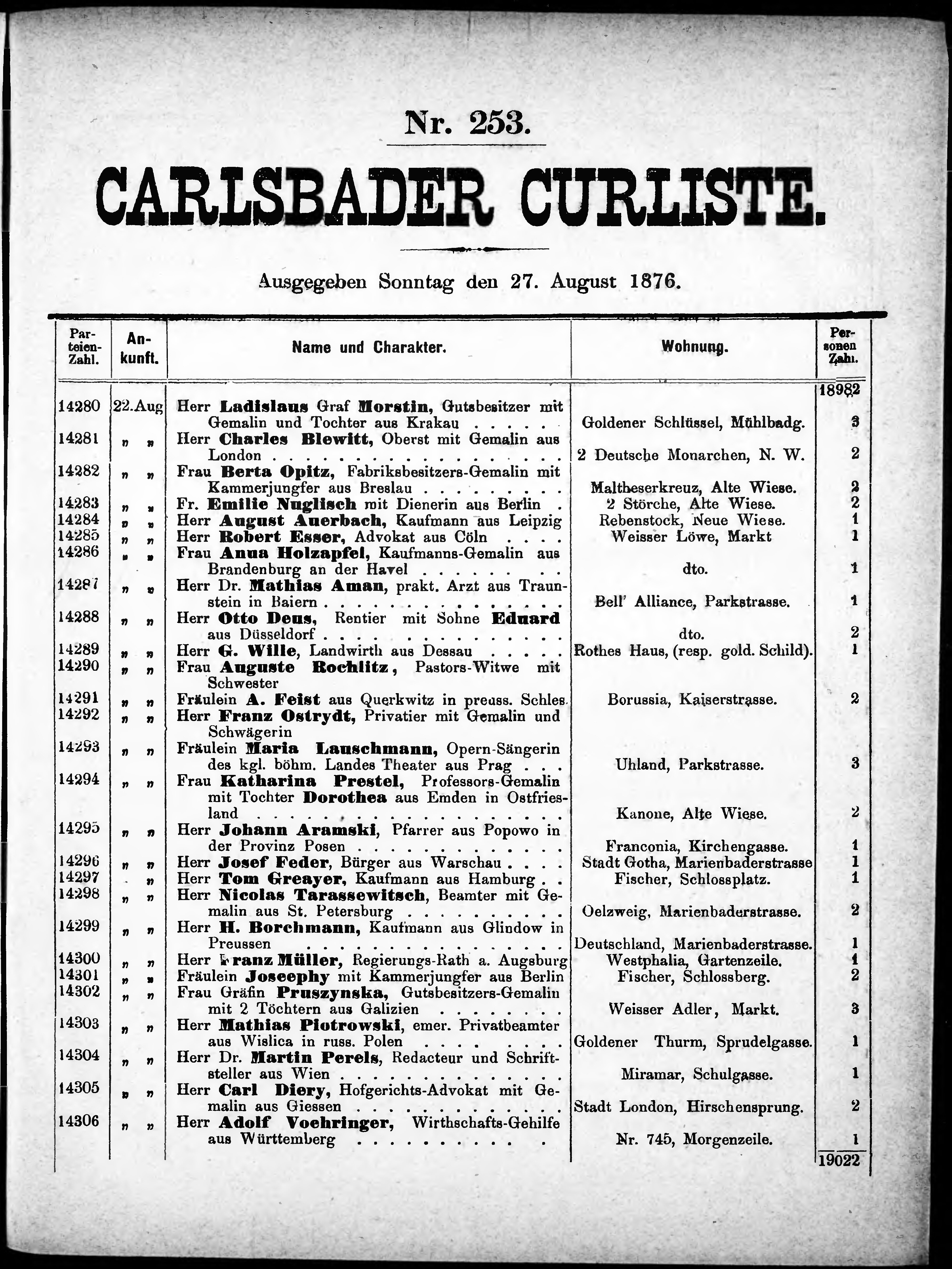 Liste der angekommenen und abgereisten P. T. Curgäste in Carlsbad im Jahre