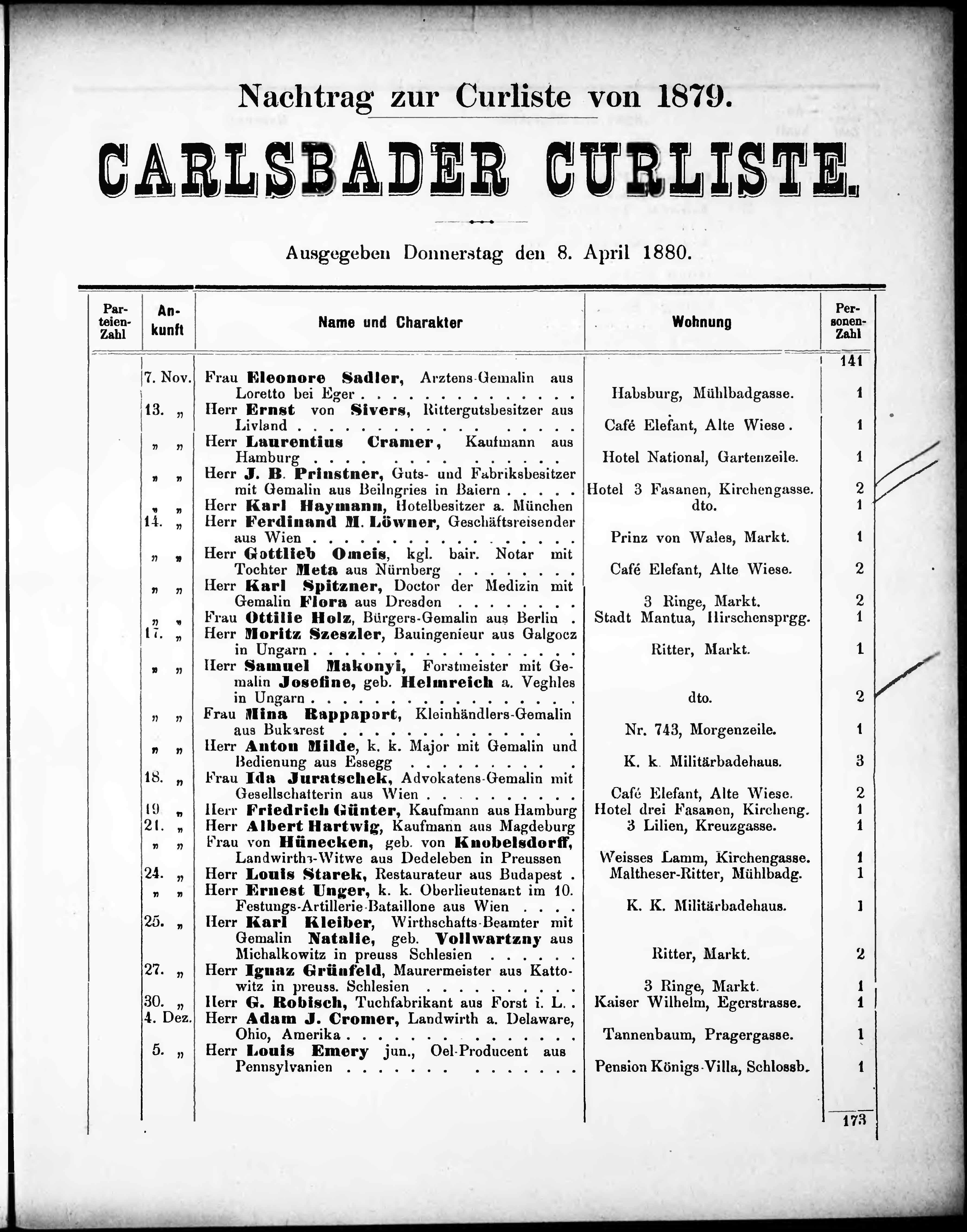 Liste der angekommenen und abgereisten P. T. Curgäste in Carlsbad im Jahre