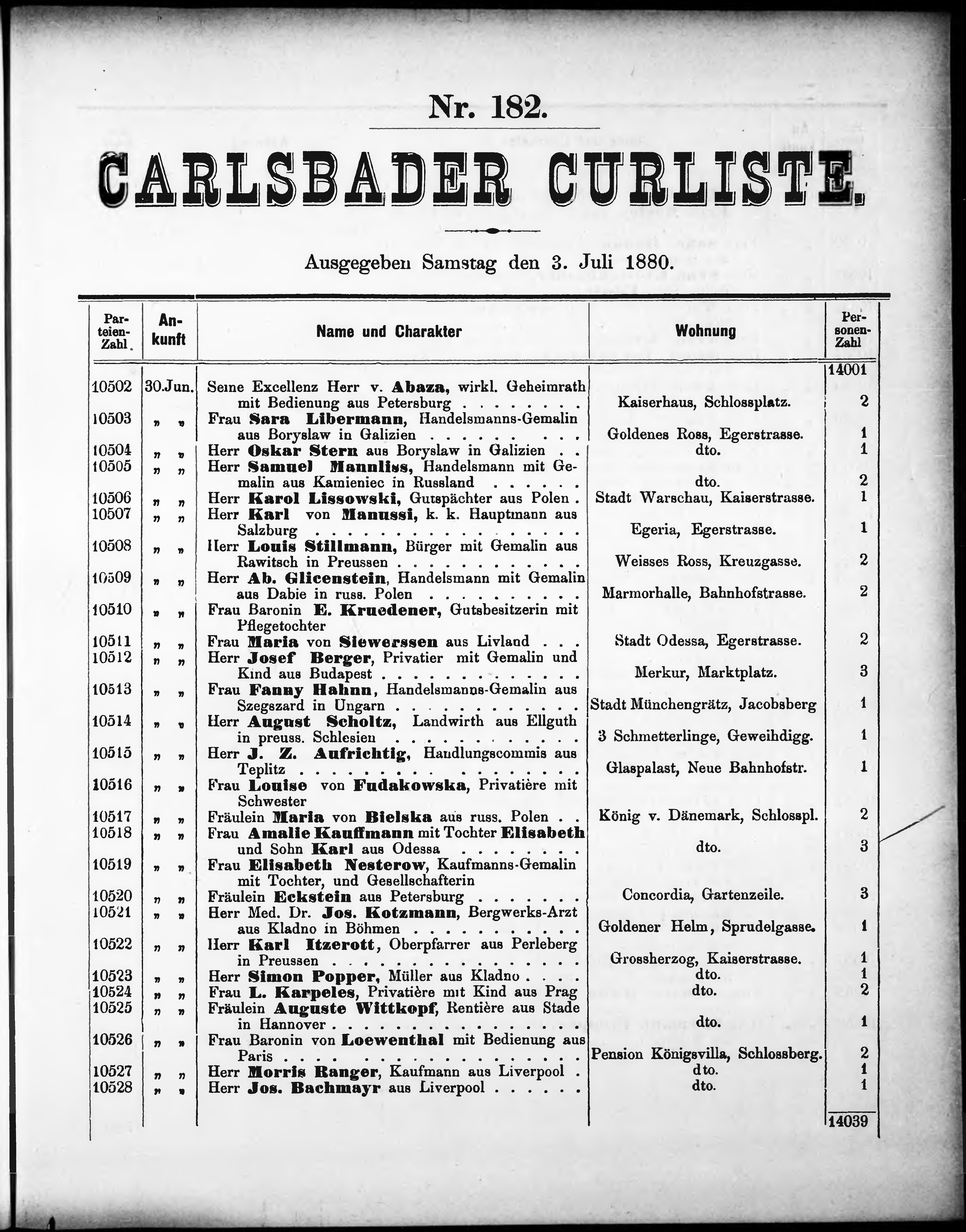 Liste der im Jahre ... angekommenen und abgereisten Kur- und Badegäste in Karlsb...