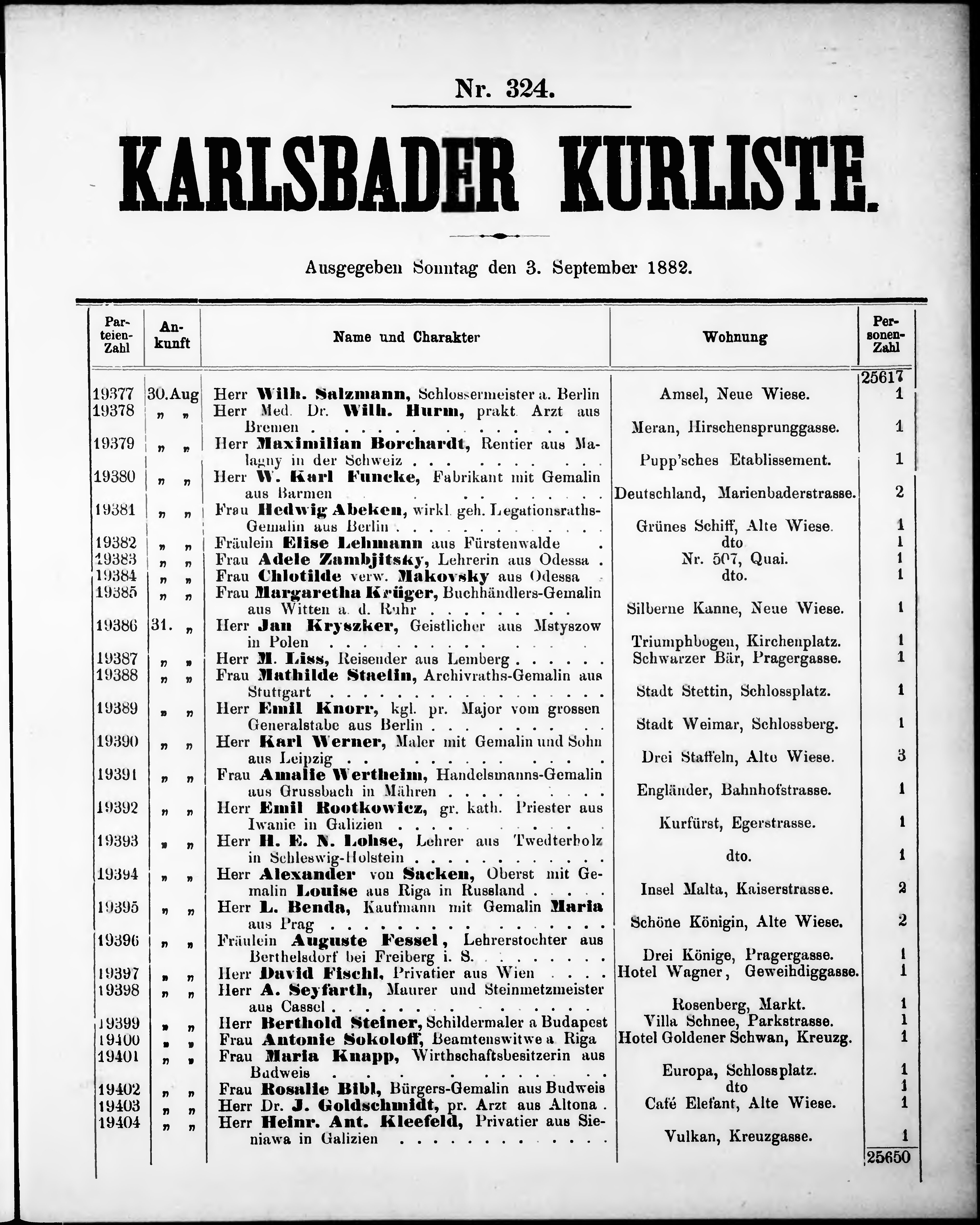 Liste der im Jahre ... angekommenen P.T. Kurgäste in der königl. Stadt Kaiser-Ca...