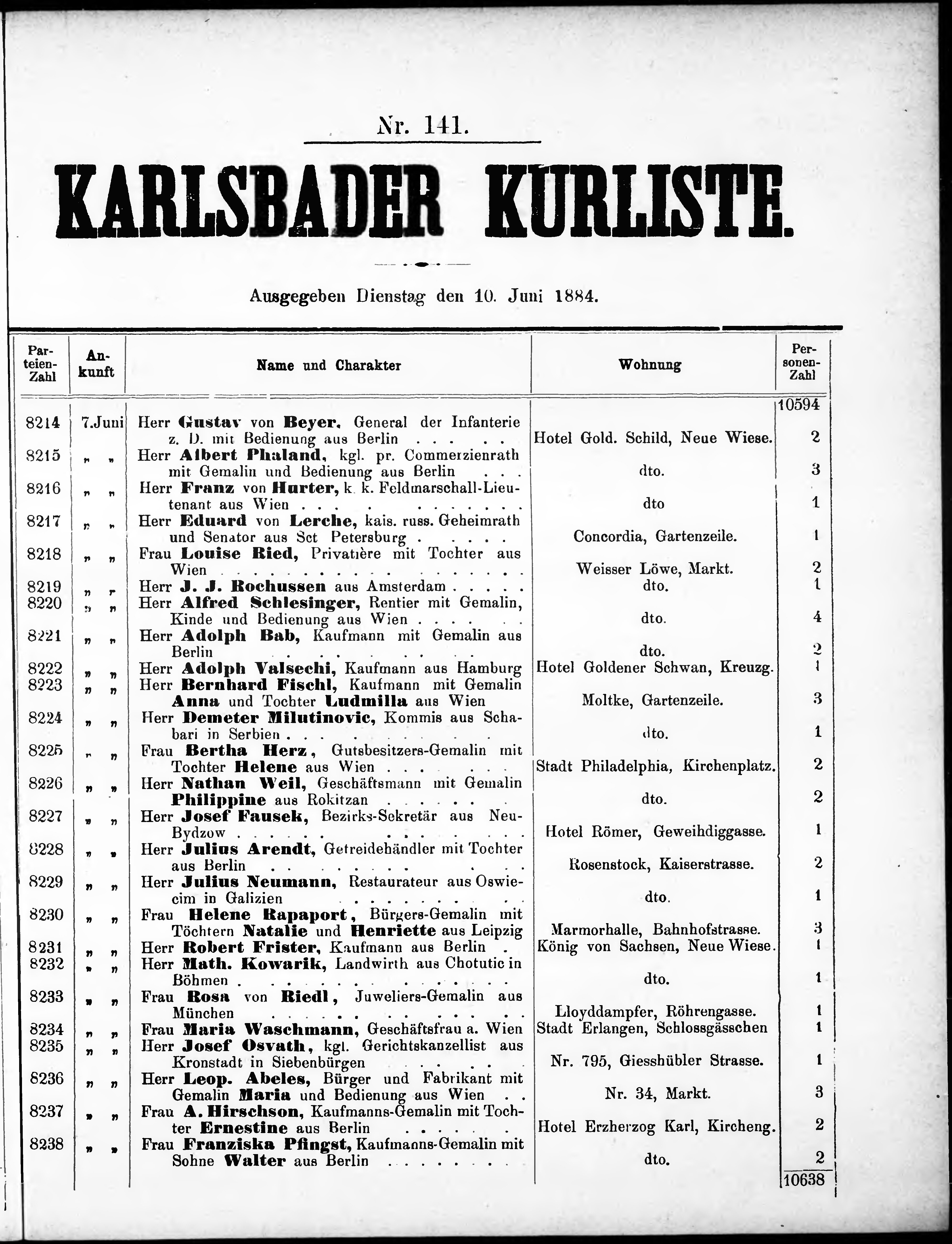 Liste der im Jahre ... angekommenen und abgereisten Kur- und Badegäste in Karlsb...