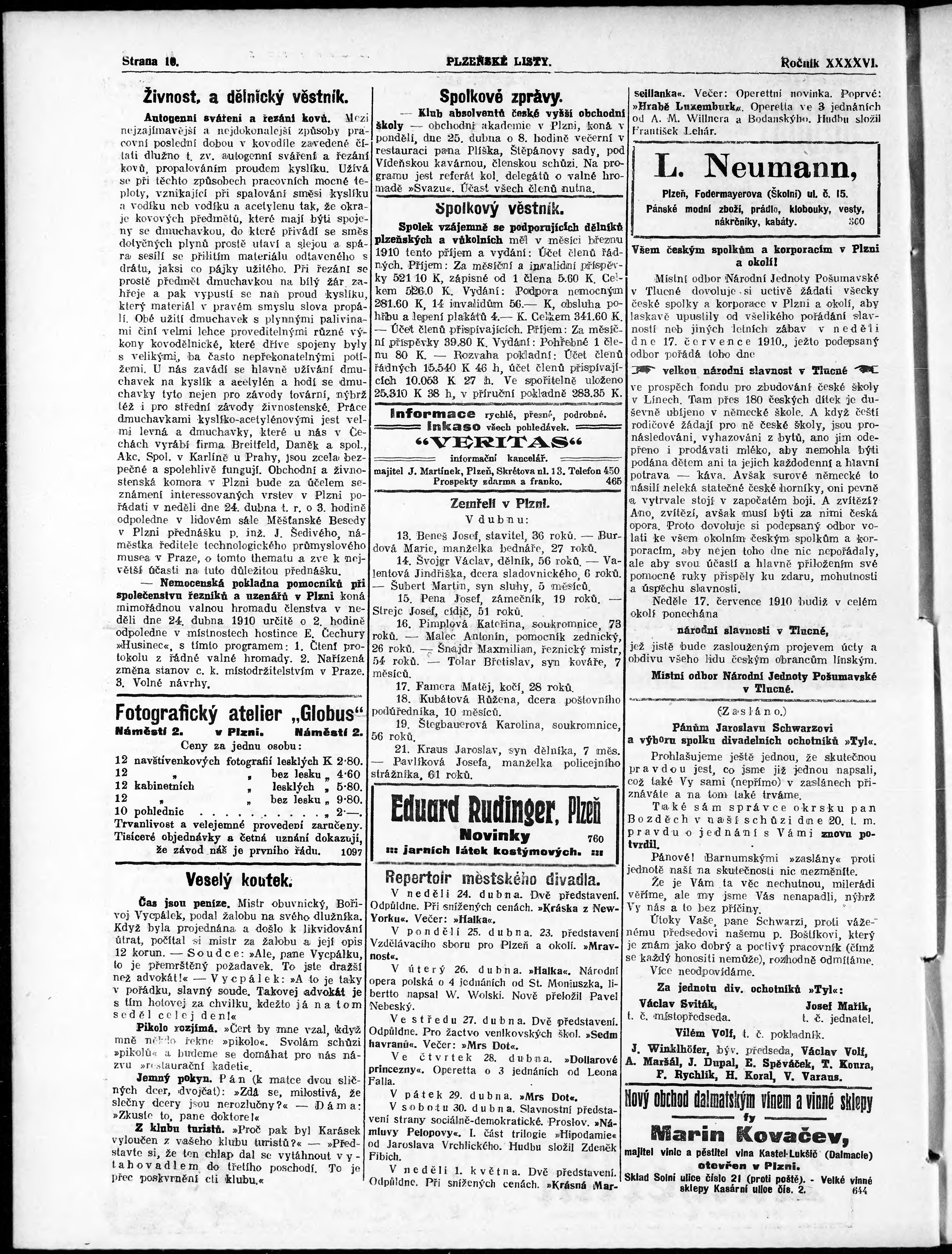 * Datum vydání výtisku: 23.4.1910 Číslo výtisku: 92 Poznámky k výtisku: nekonzistence číslování stran;