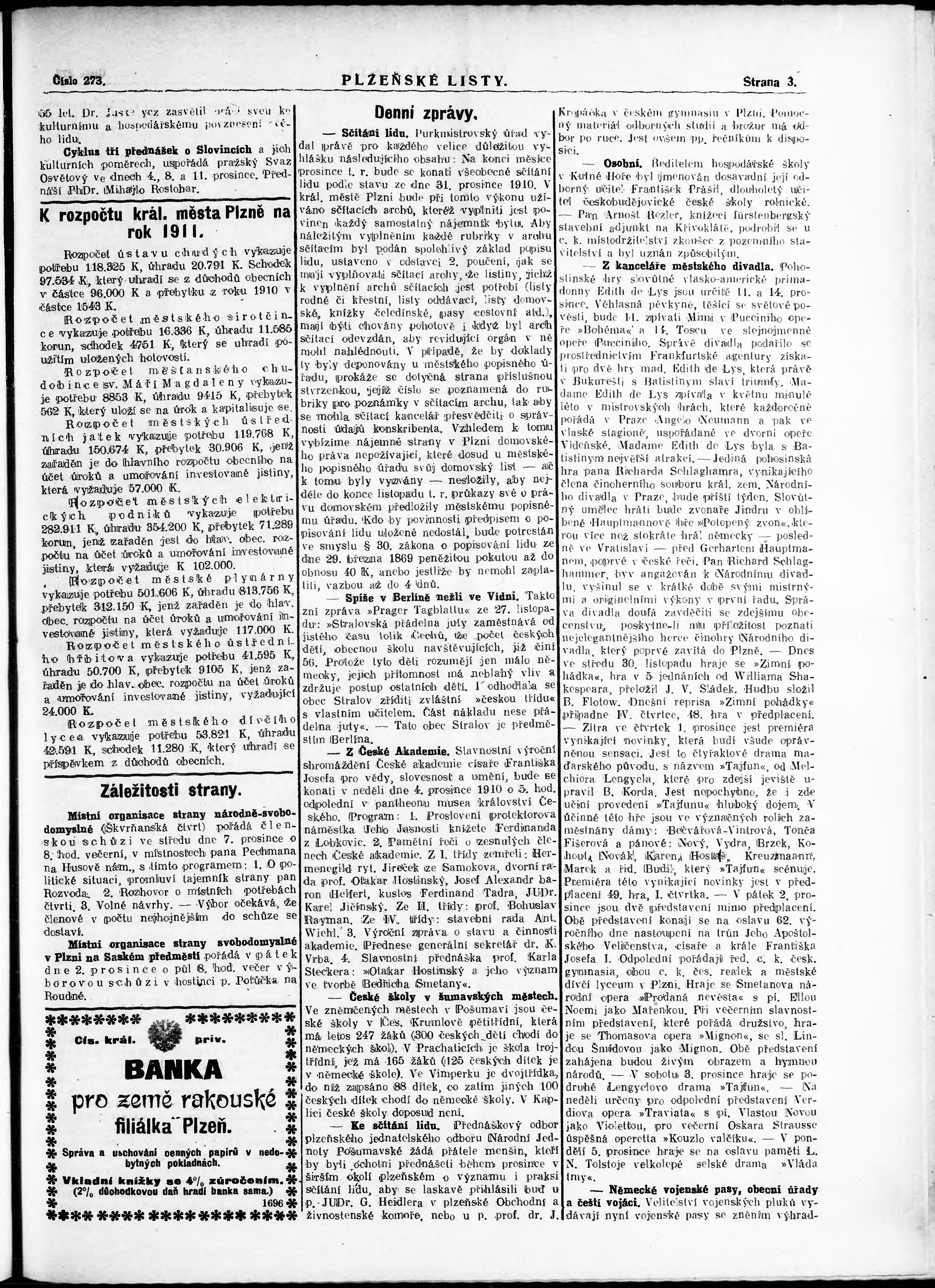 * Datum vydání výtisku: 30.11.1910 Číslo výtisku: 273 Poznámky k výtisku: nekonzistence číslování stran;