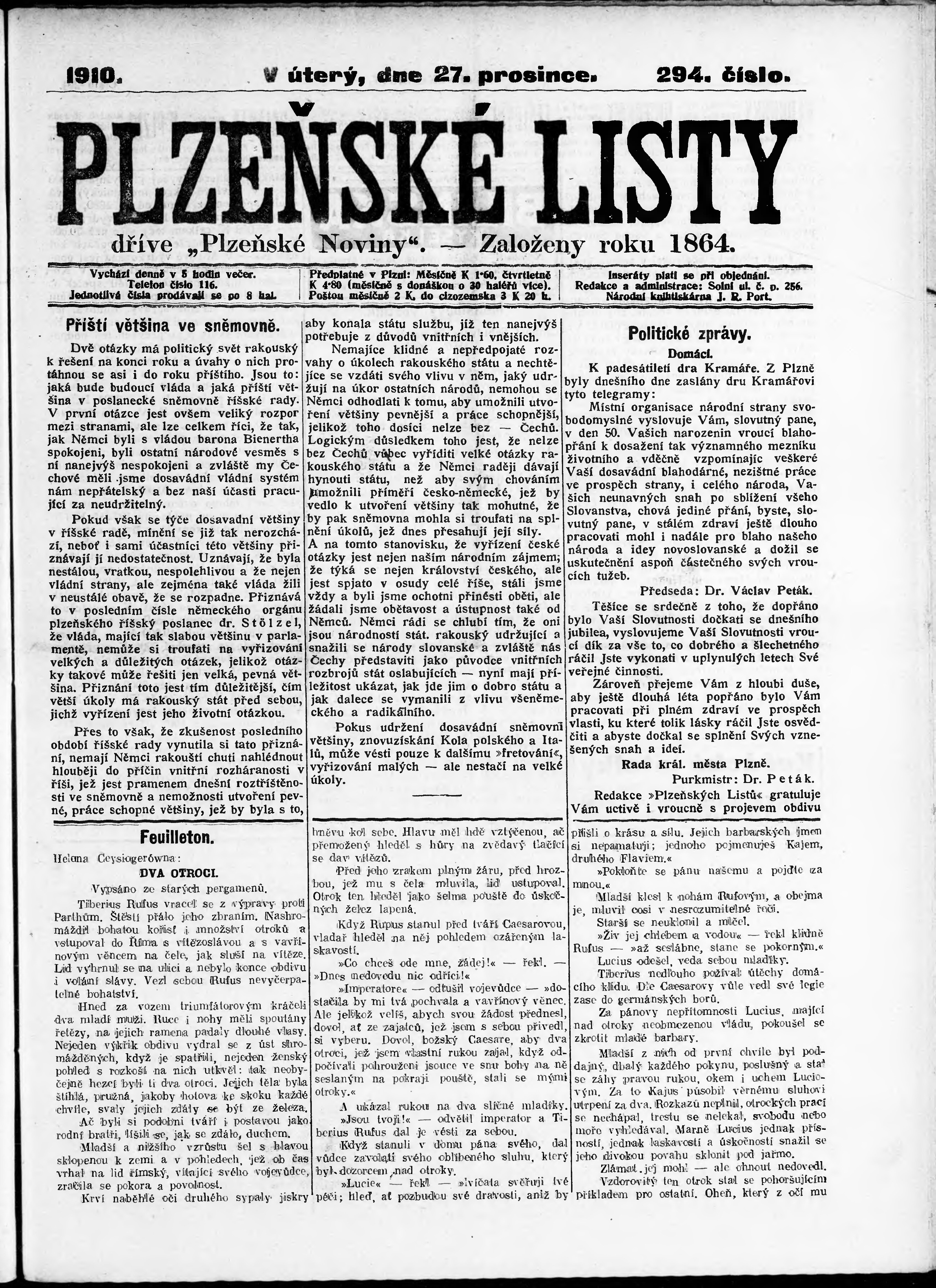 * Datum vydání výtisku: 27.12.1910 Číslo výtisku: 294