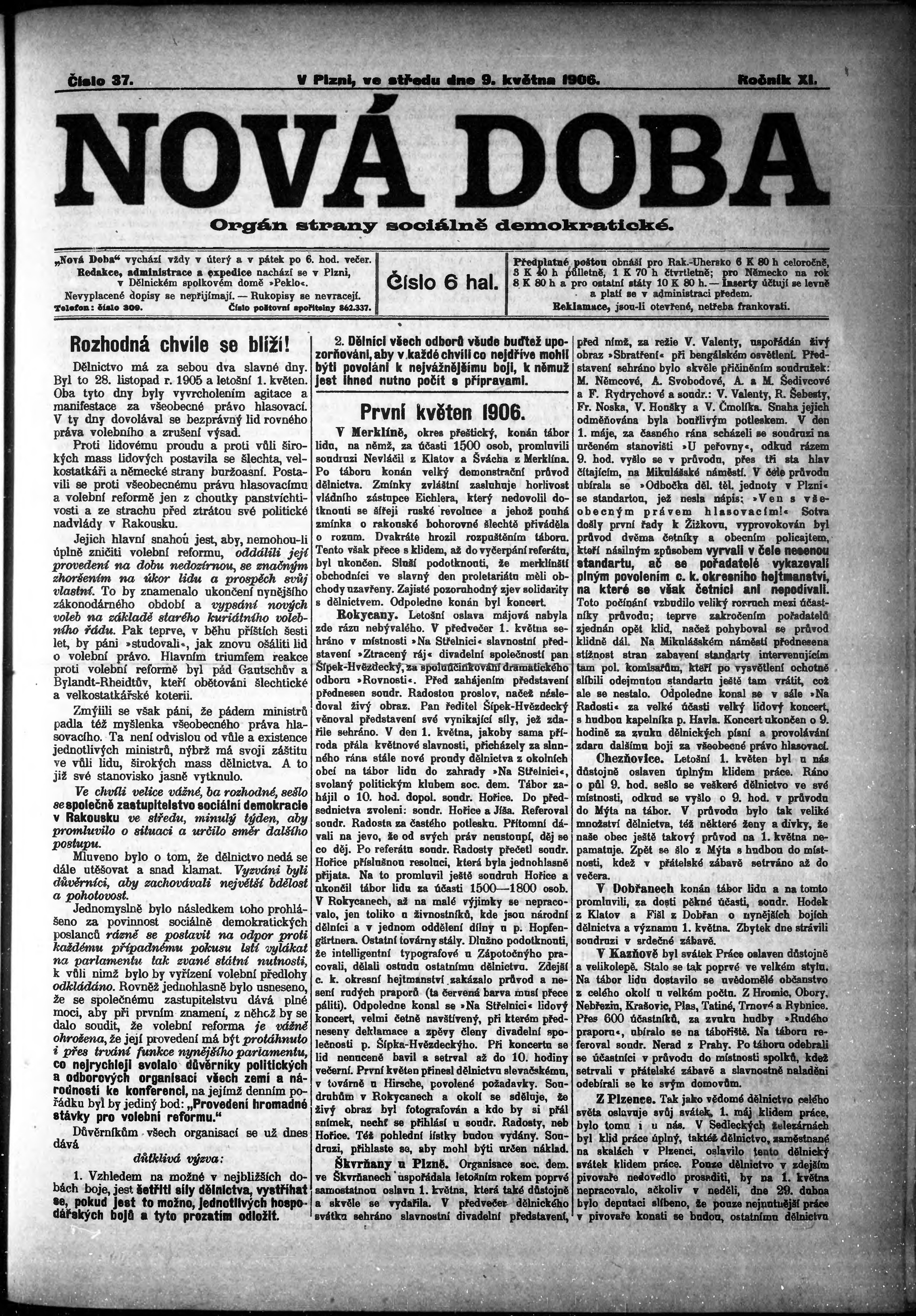 * Datum vydání výtisku: 9.5.1906 Číslo výtisku: 37