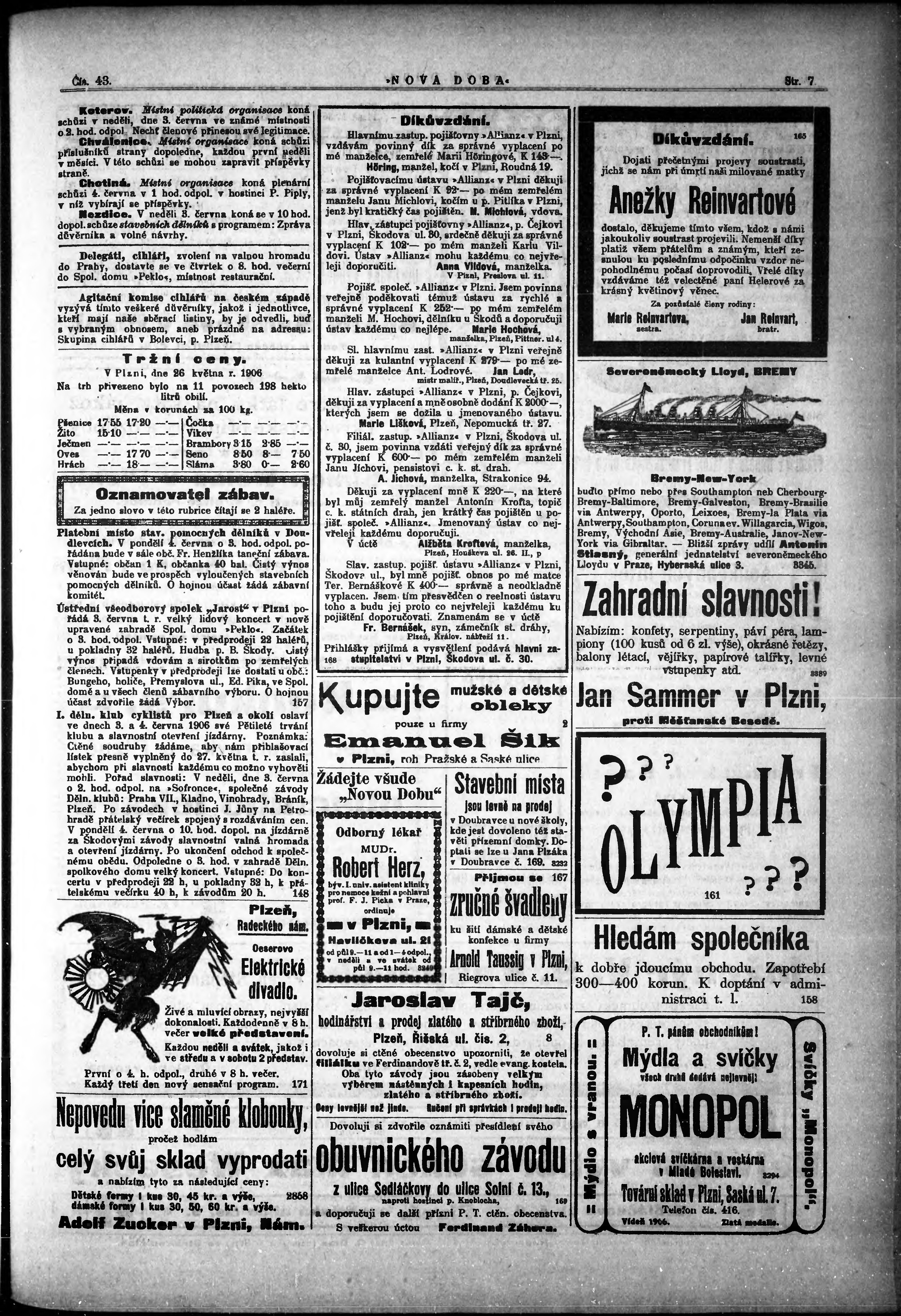* Datum vydání výtisku: 30.5.1906 Číslo výtisku: 43