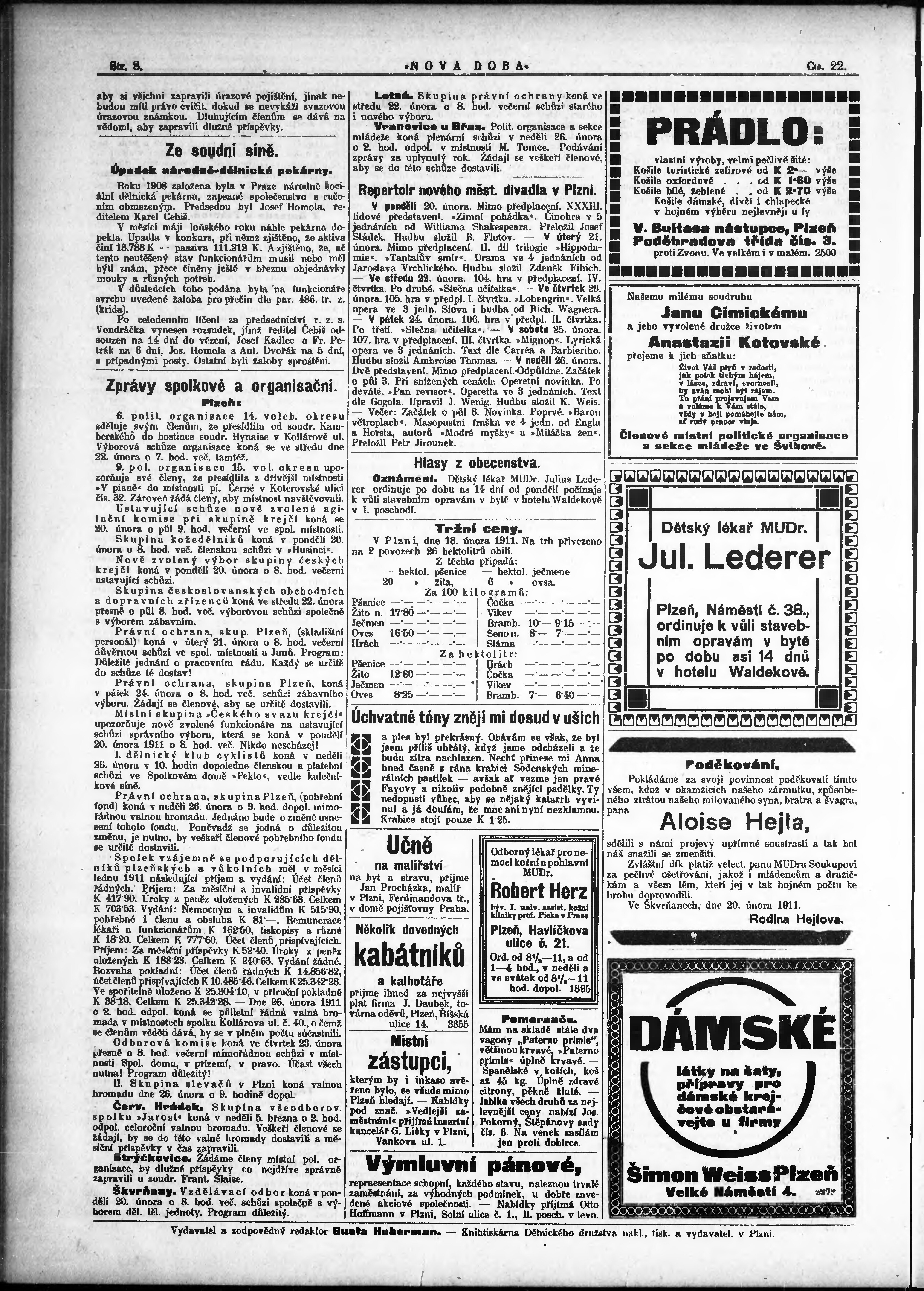 * Datum vydání výtisku: 20.2.1911 Číslo výtisku: 22