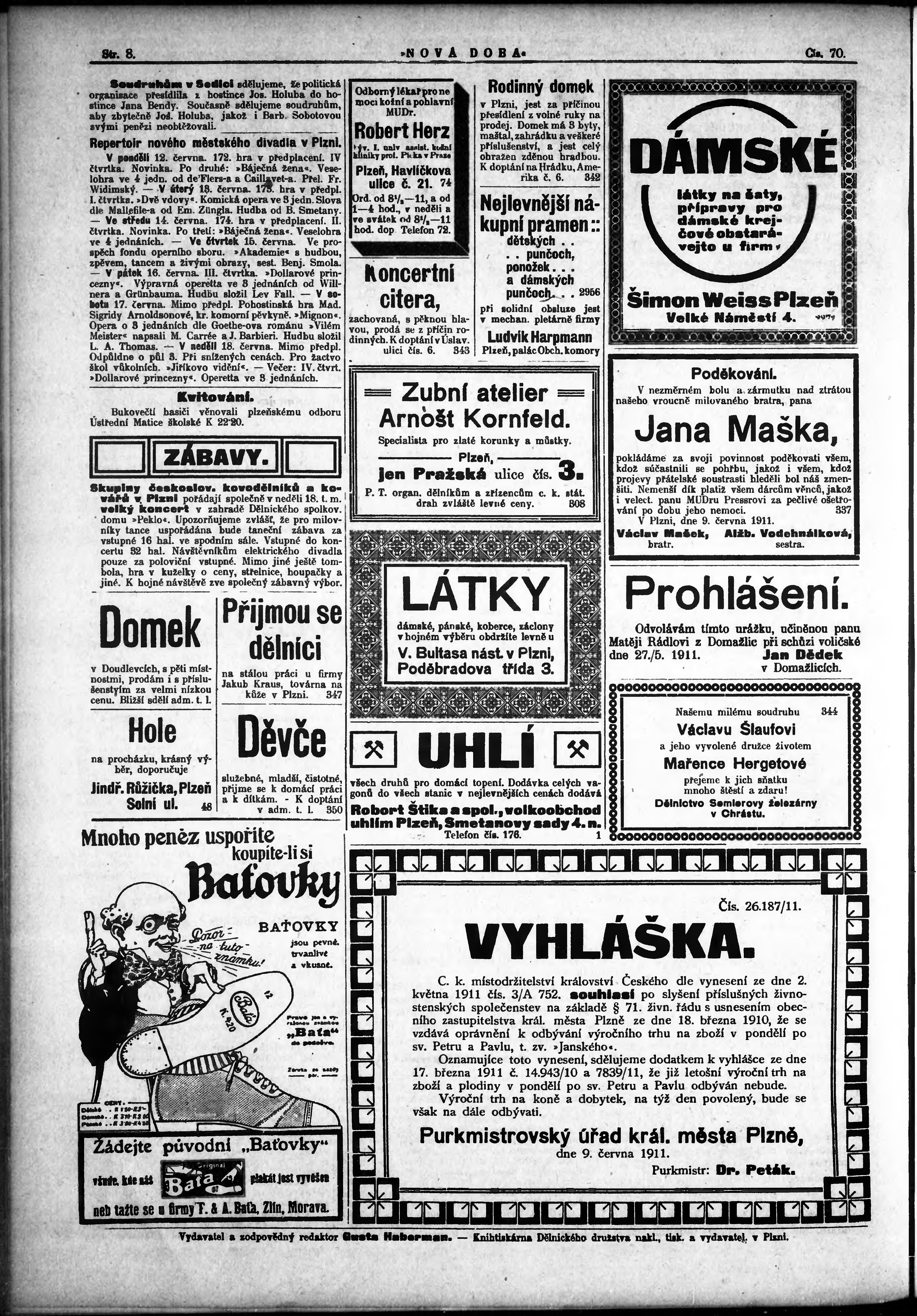 * Datum vydání výtisku: 12.6.1911 Číslo výtisku: 70