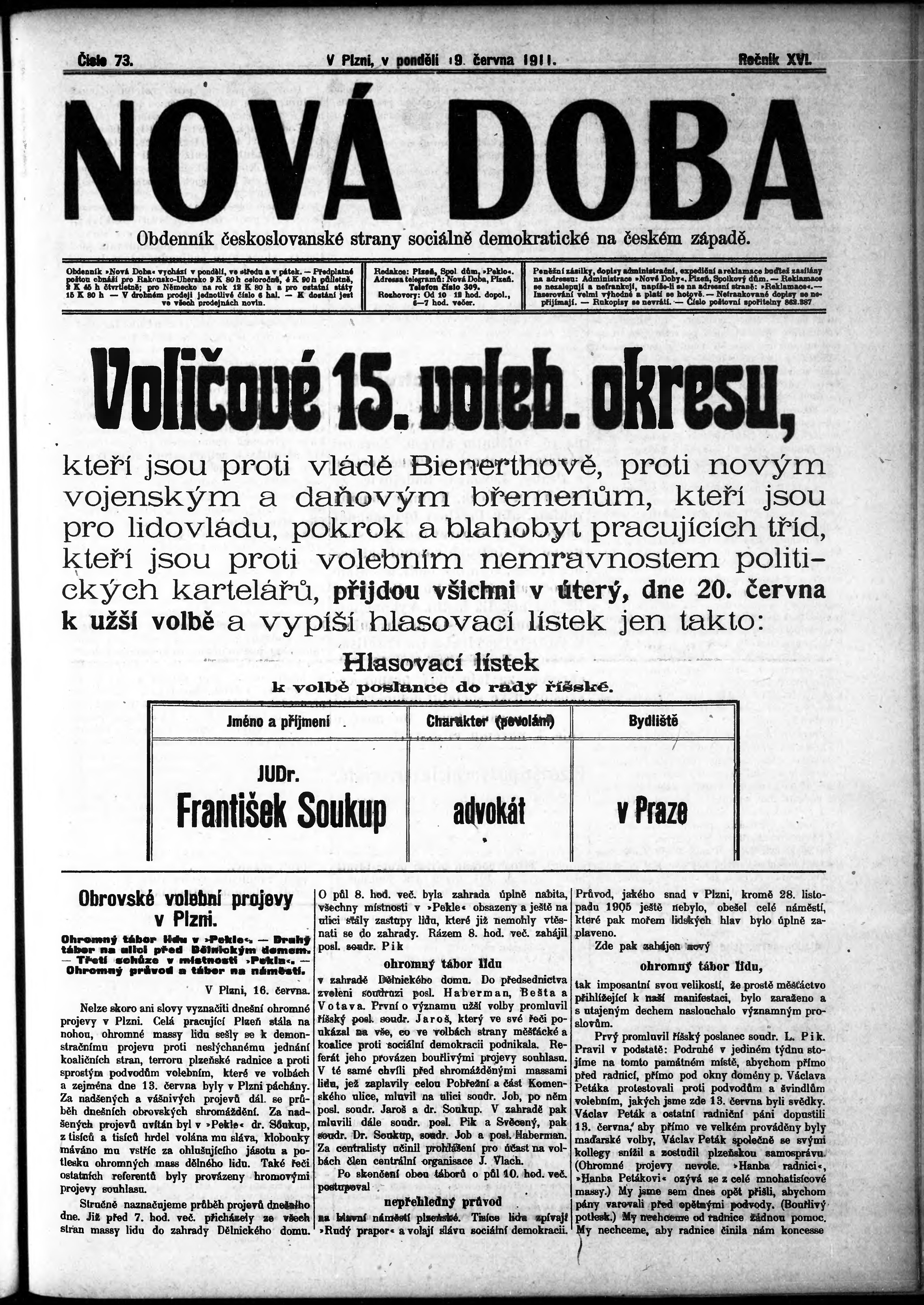 * Datum vydání výtisku: 19.6.1911 Číslo výtisku: 73