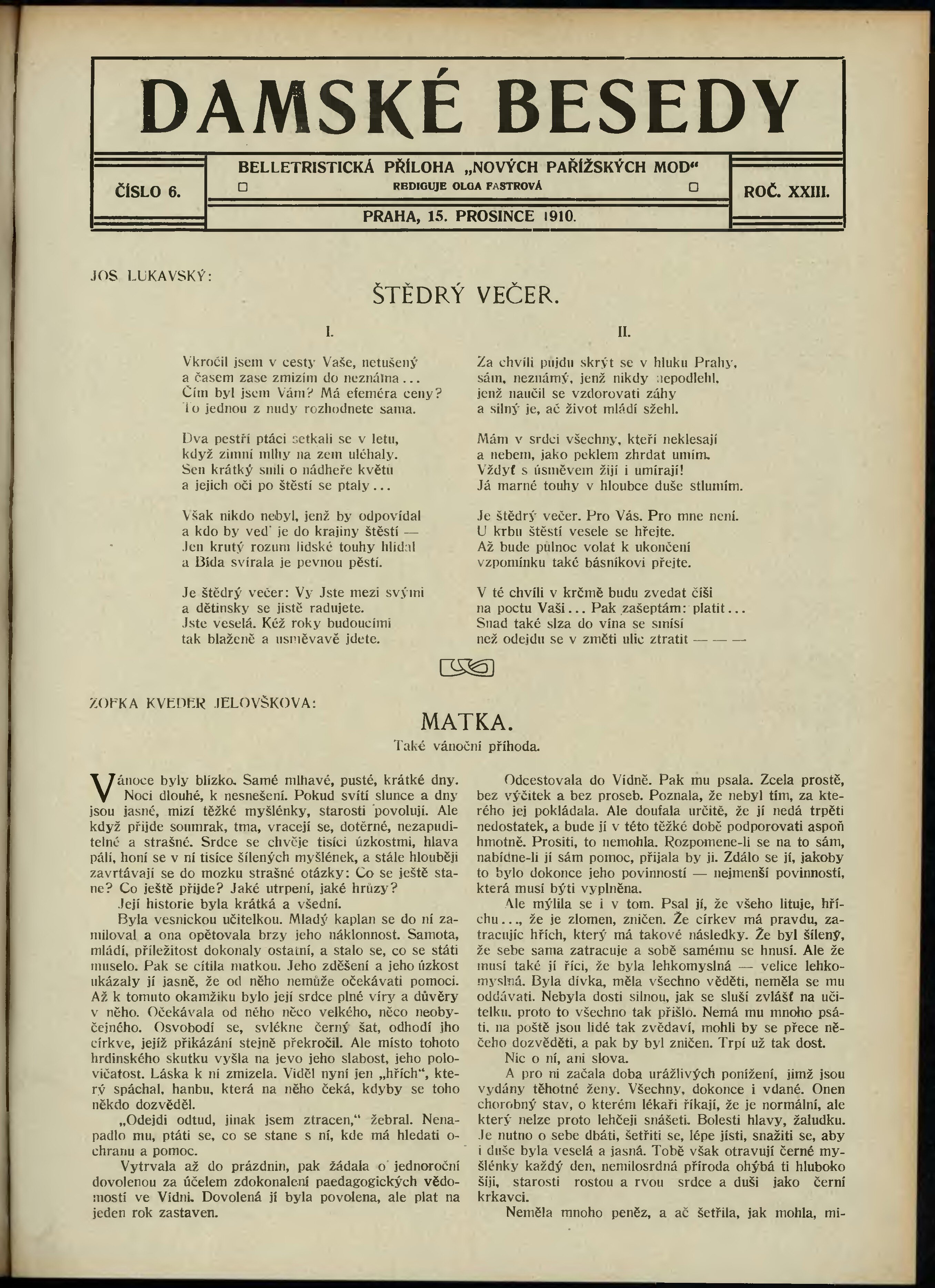 * Datum vydání výtisku: 15.12.1910 Číslo výtisku: 6 Typ výtisku: příloha Poznámky k výtisku: belletristická příloha;
