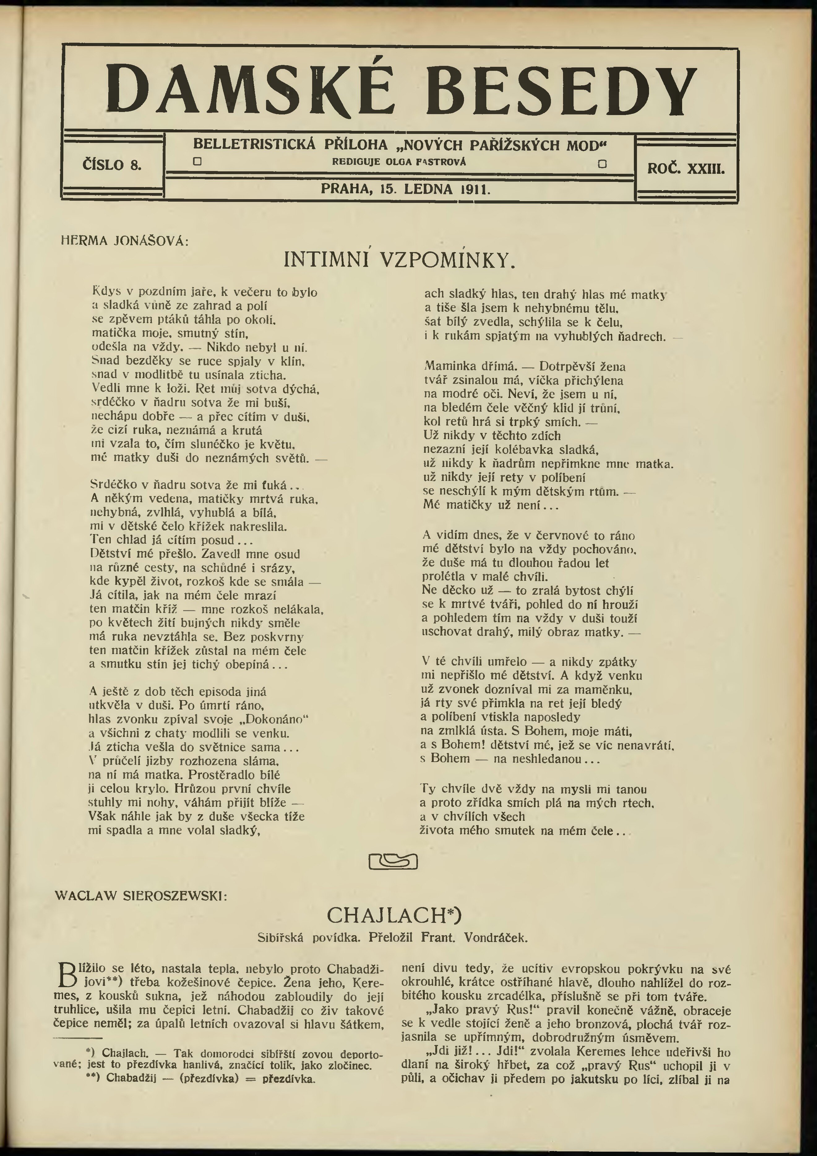* Datum vydání výtisku: 15.1.1911 Číslo výtisku: 8 Typ výtisku: příloha Poznámky k výtisku: belletristická příloha;