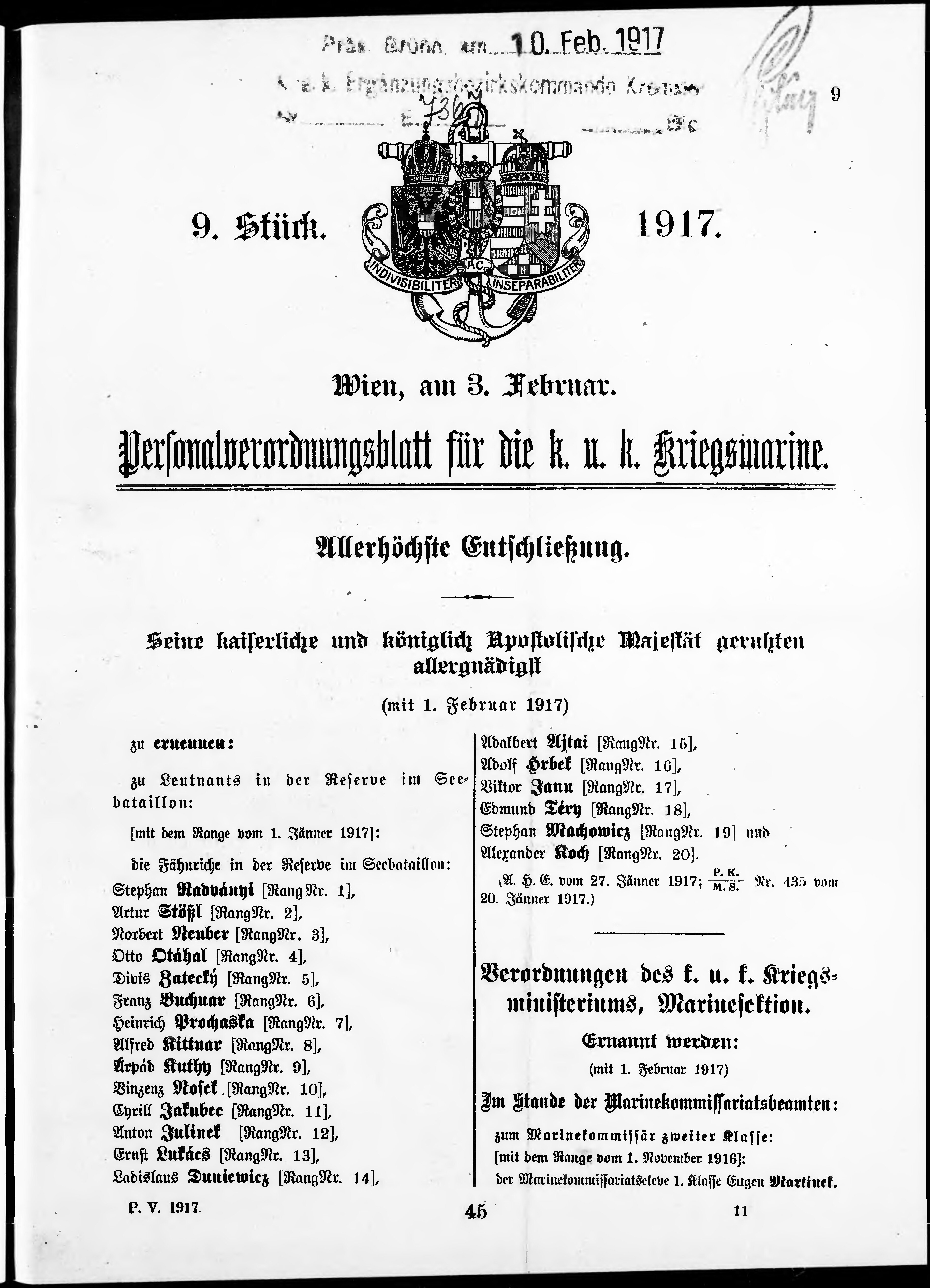 Personalvernungsblatt für die k.k. Kreigs-Marine