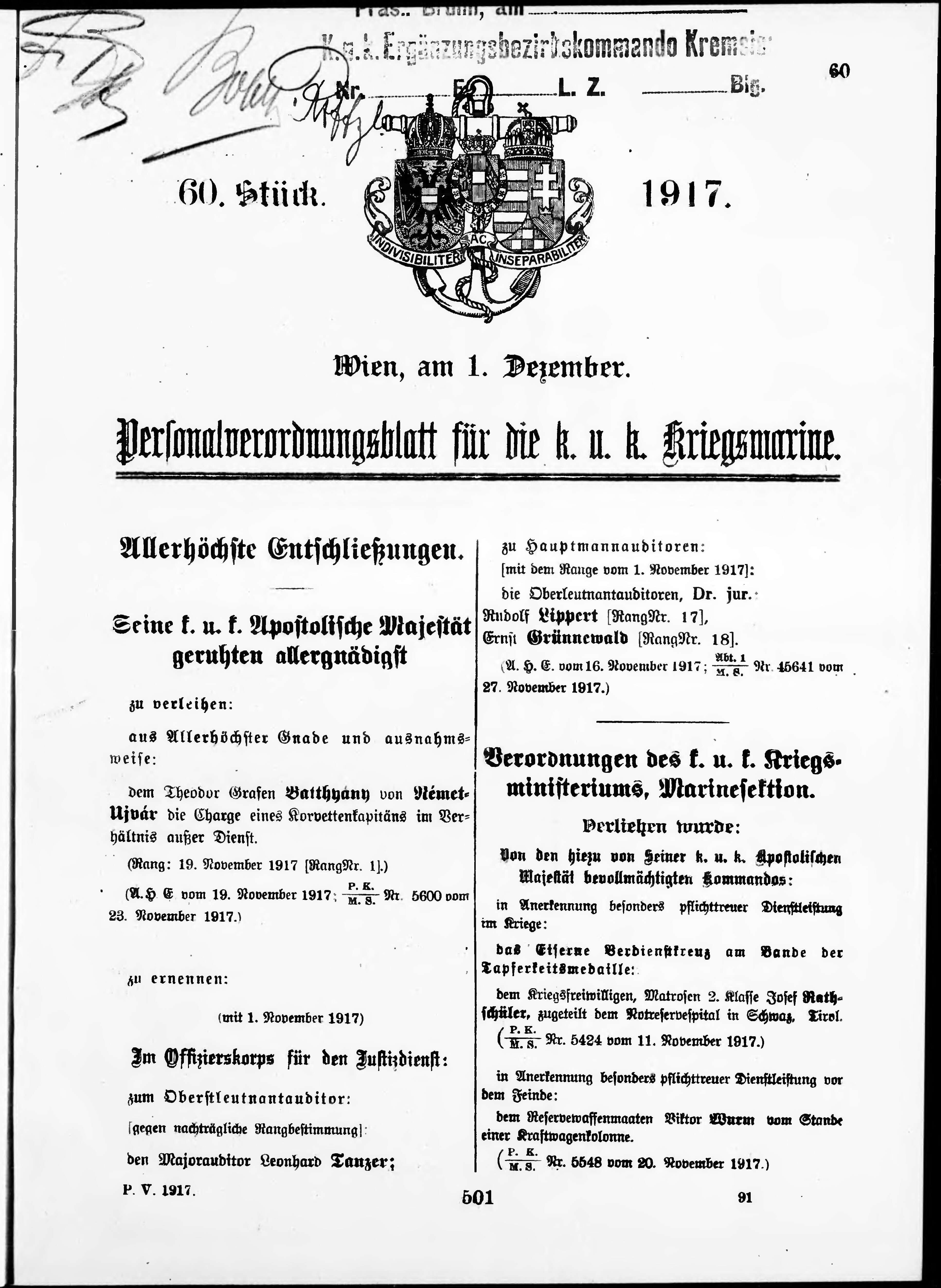Personalvernungsblatt für die k.k. Kreigs-Marine