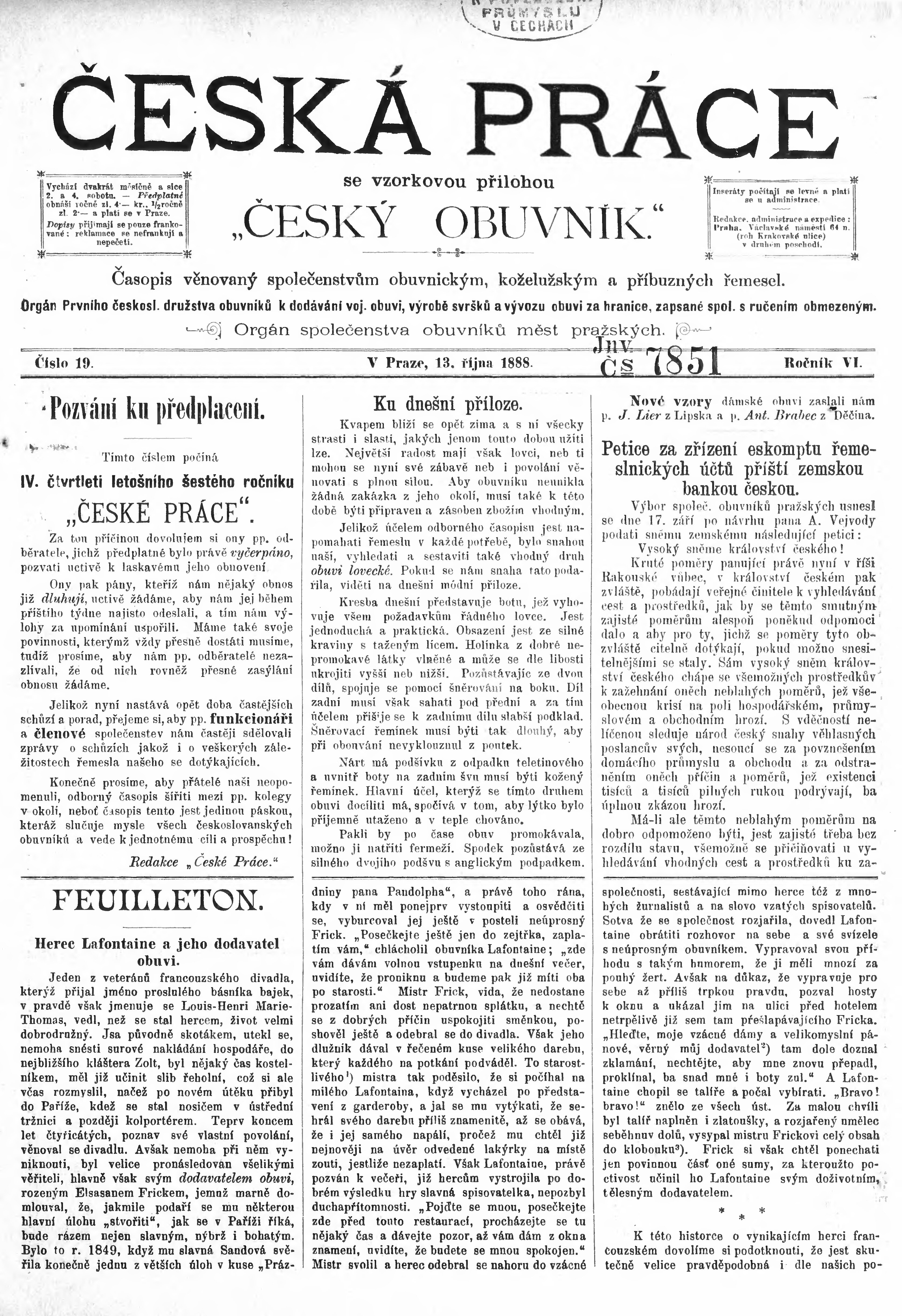 * Datum vydání výtisku: 13.10.1888 Číslo výtisku: 19