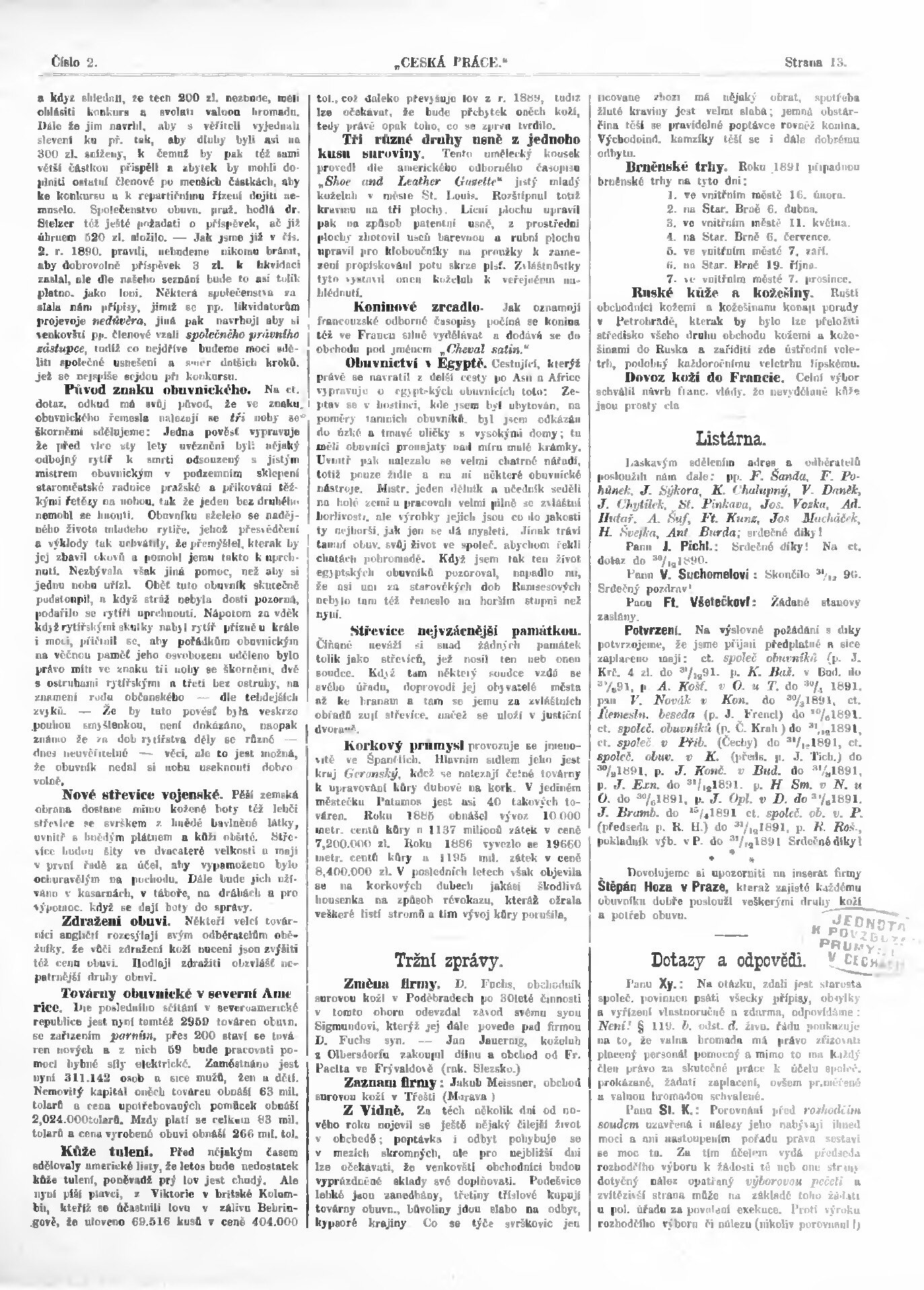 * Datum vydání výtisku: 18.1.1891 Číslo výtisku: 2