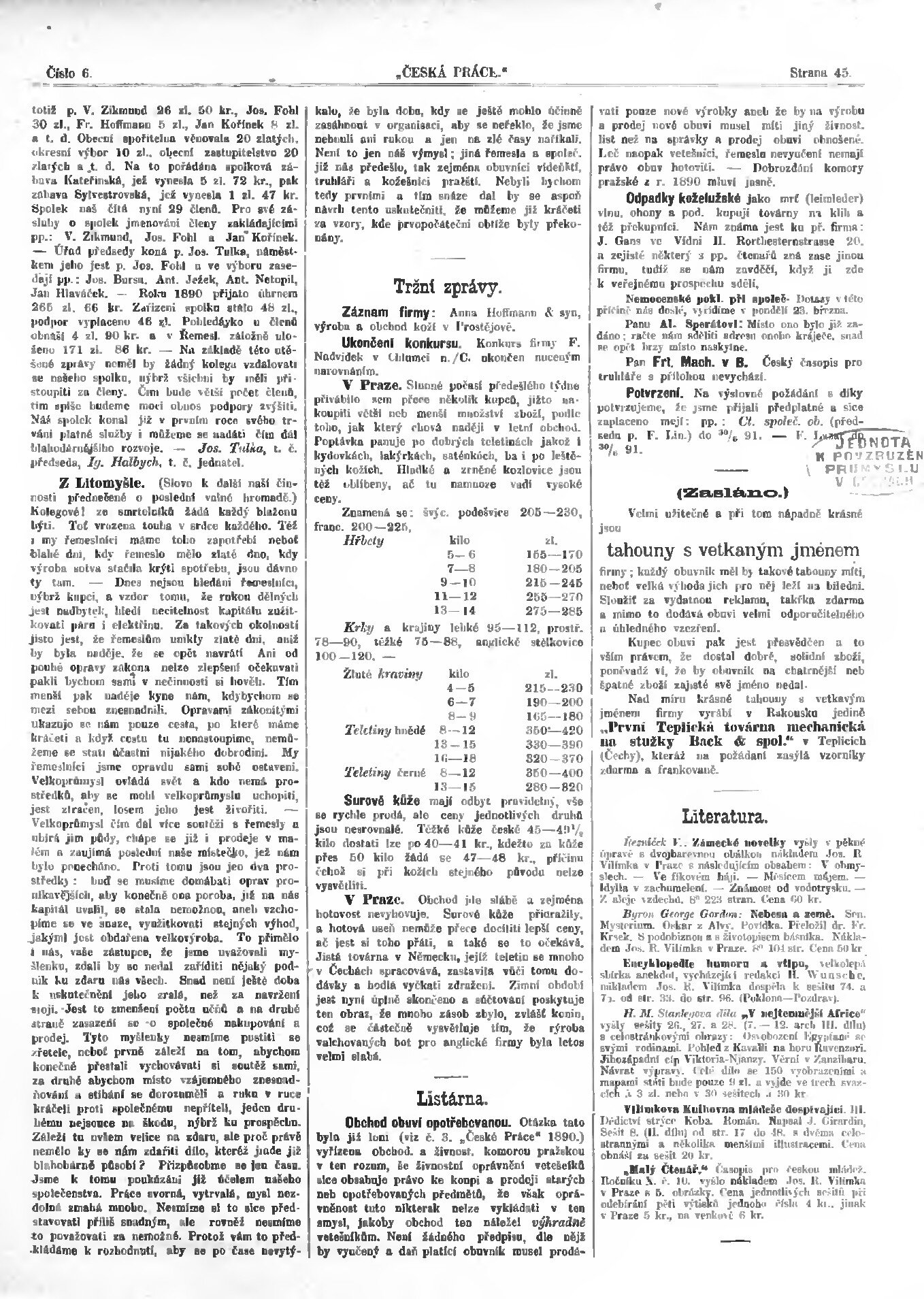 * Datum vydání výtisku: 22.3.1891 Číslo výtisku: 6
