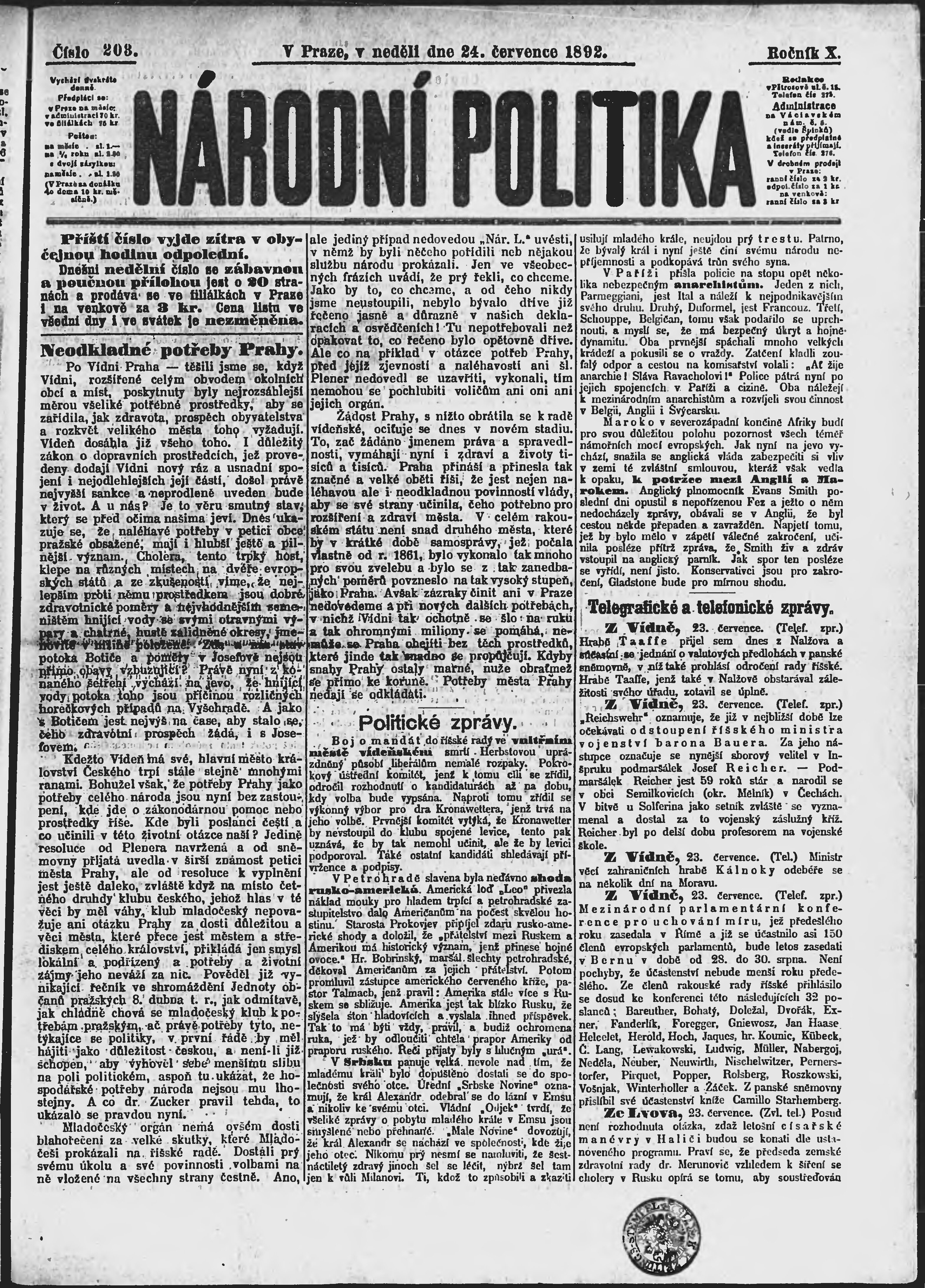 * Datum vydání výtisku: 24.7.1892 Číslo výtisku: 203 Poznámky k výtisku: ranní vydání;