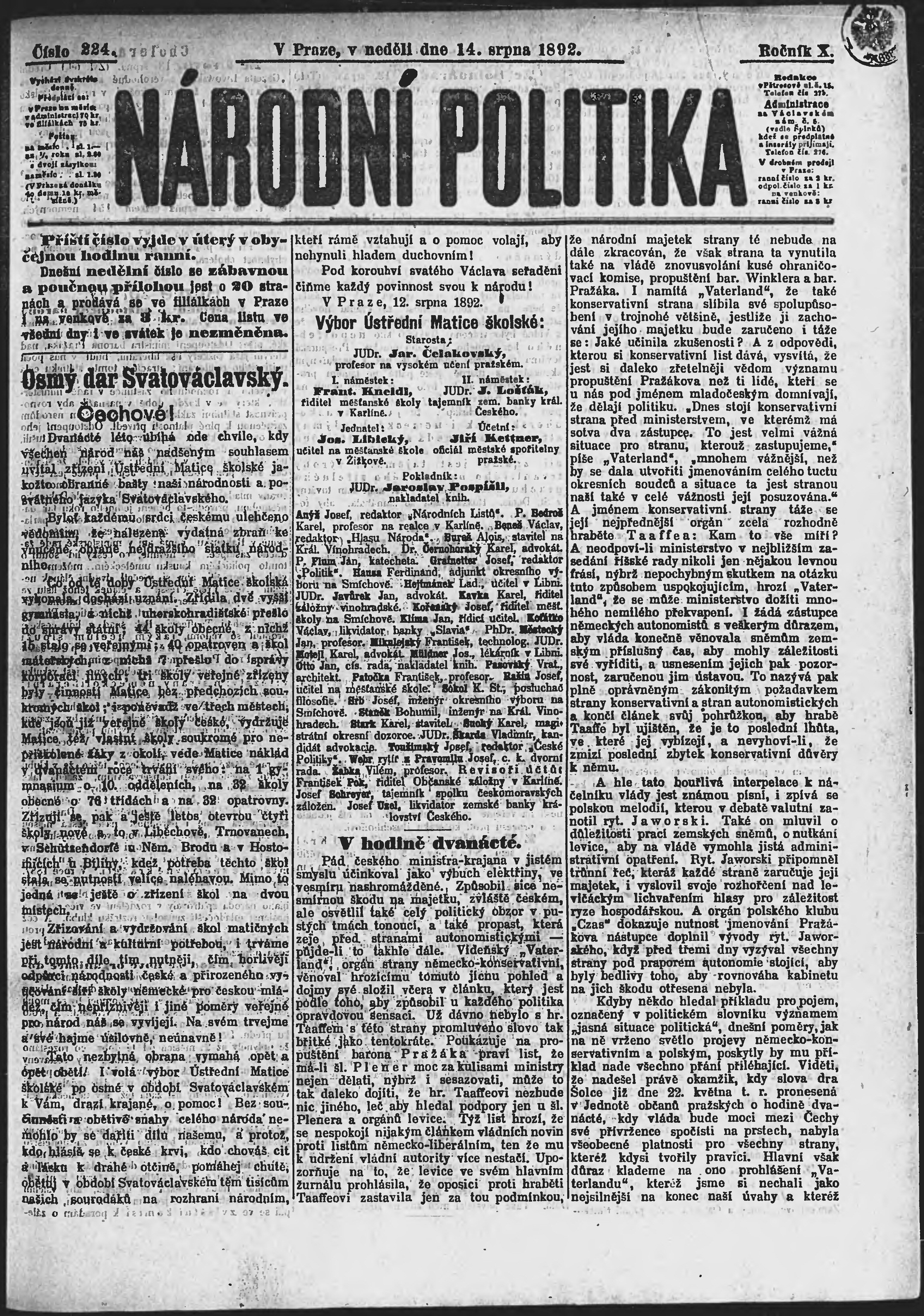 * Datum vydání výtisku: 14.8.1892 Číslo výtisku: 224 Poznámky k výtisku: ranní vydání;