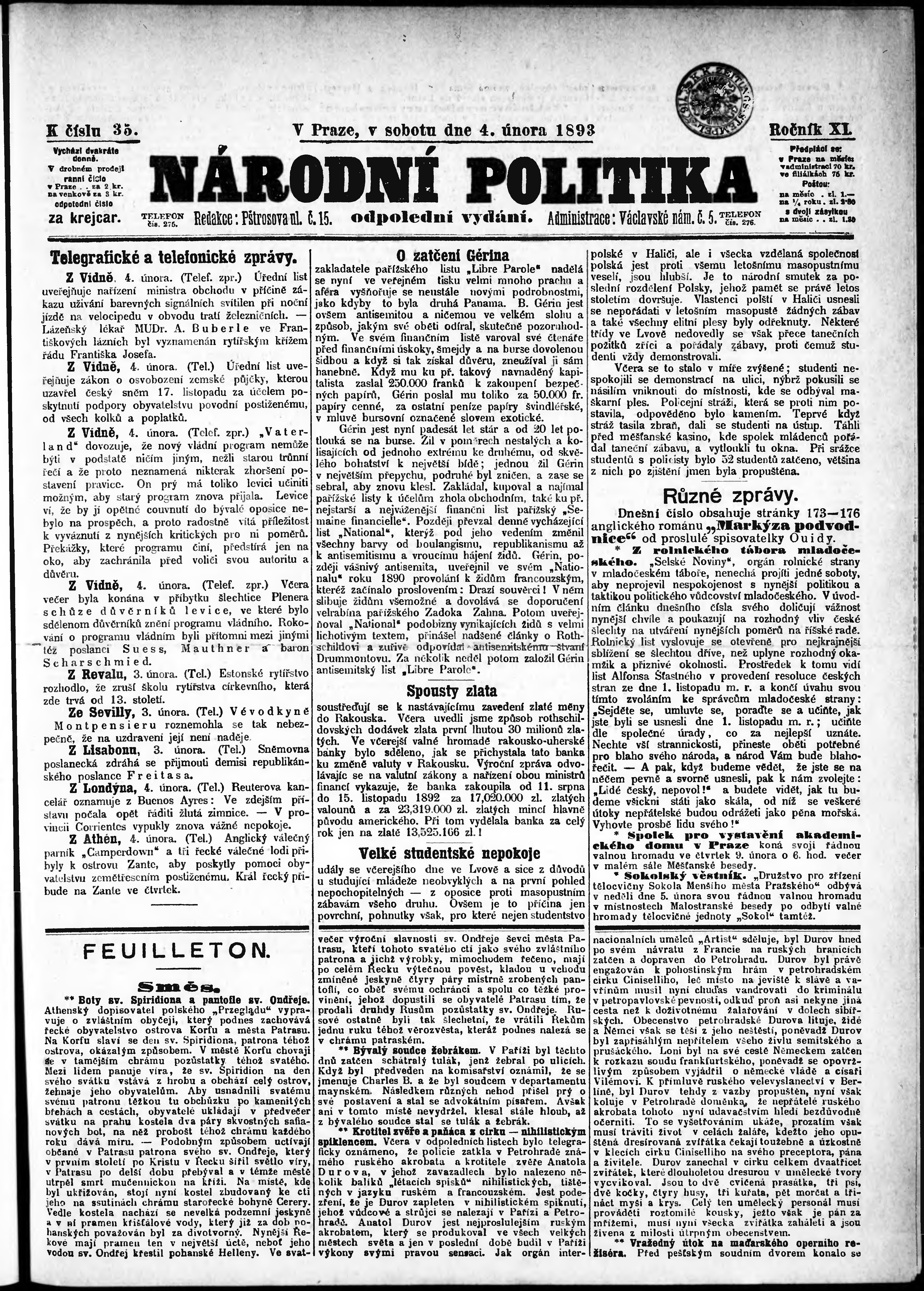 * Datum vydání výtisku: 4.2.1893 Číslo výtisku: 35 Poznámky k výtisku: odpolední vydání;