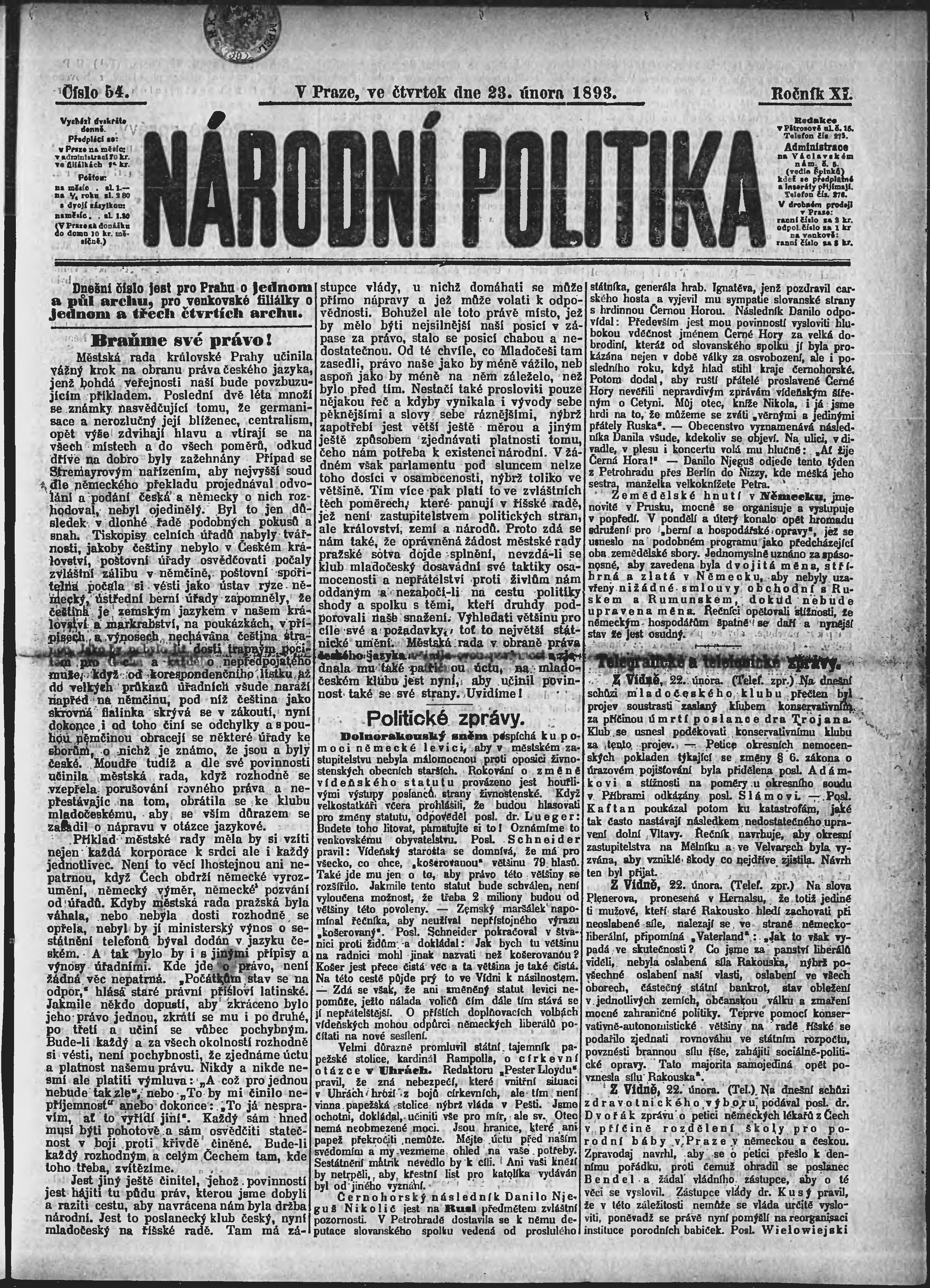 * Datum vydání výtisku: 23.2.1893 Číslo výtisku: 54 Poznámky k výtisku: ranní vydání;