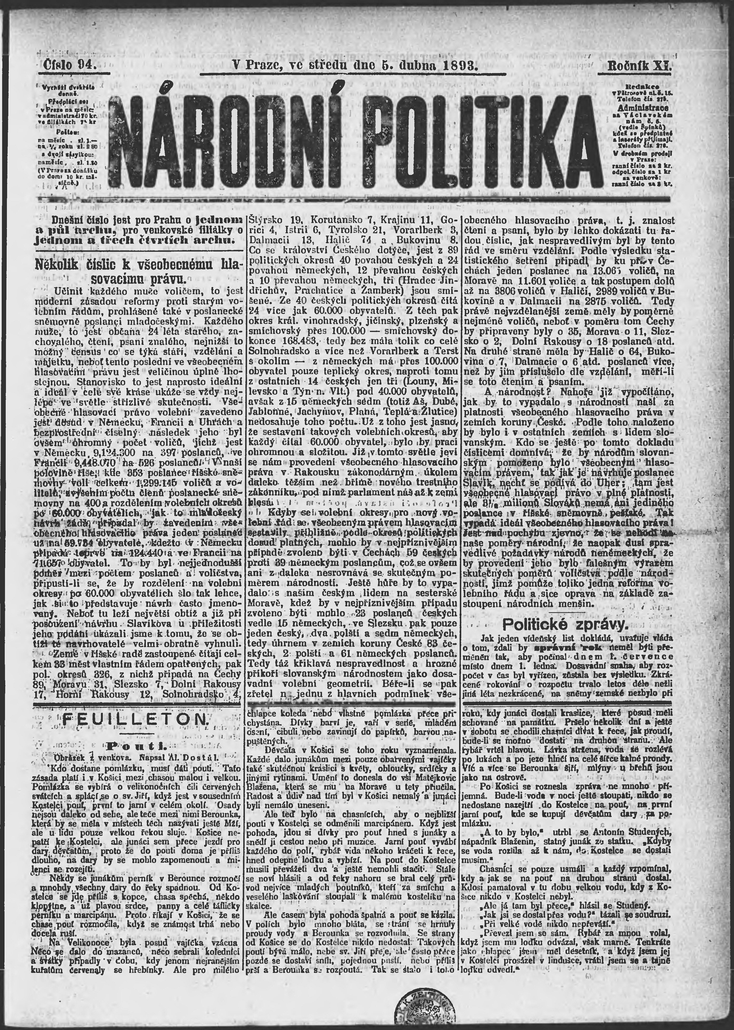 * Datum vydání výtisku: 5.4.1893 Číslo výtisku: 94 Poznámky k výtisku: ranní vydání;