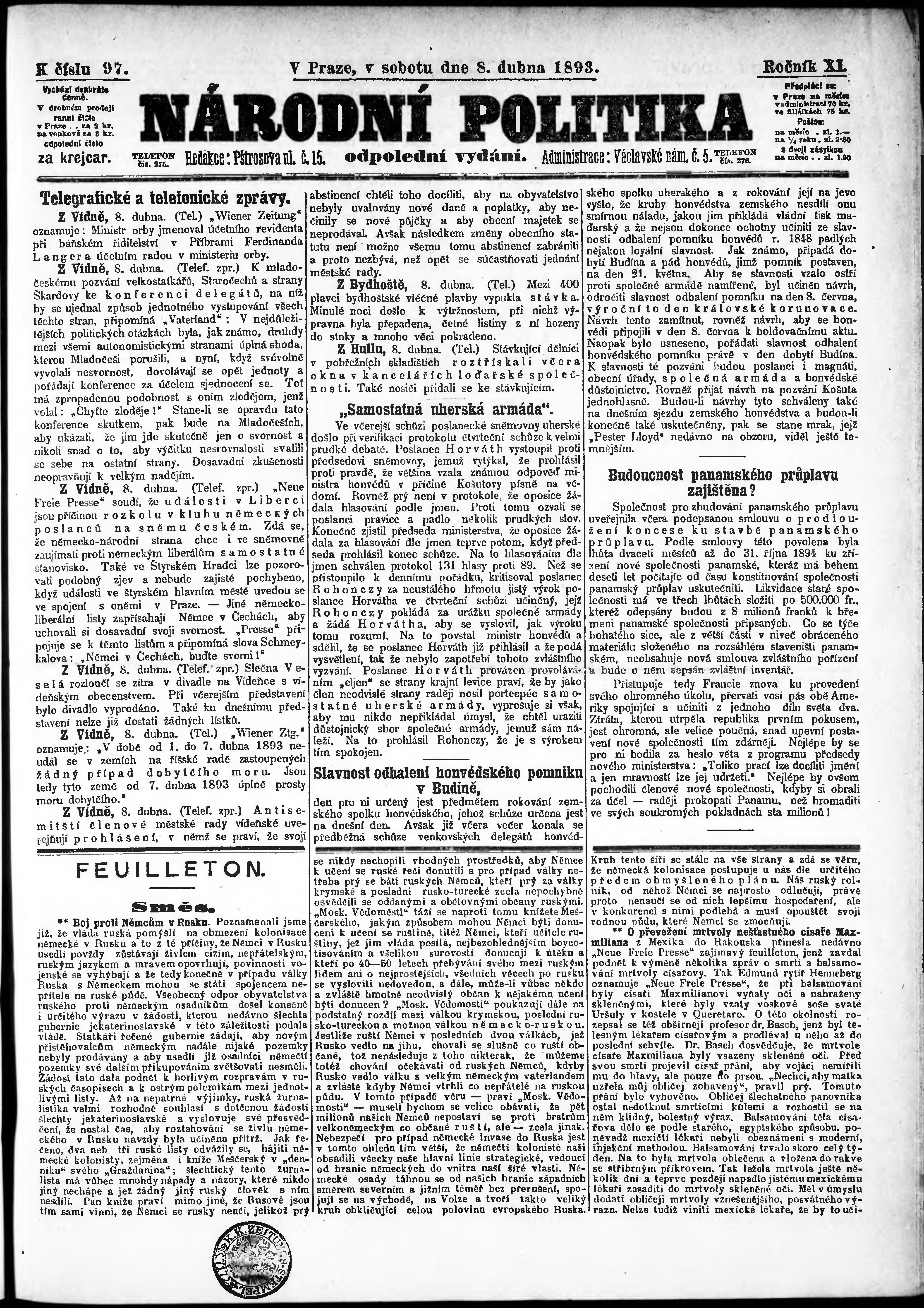 * Datum vydání výtisku: 8.4.1893 Číslo výtisku: 97 Poznámky k výtisku: odpolední vydání;