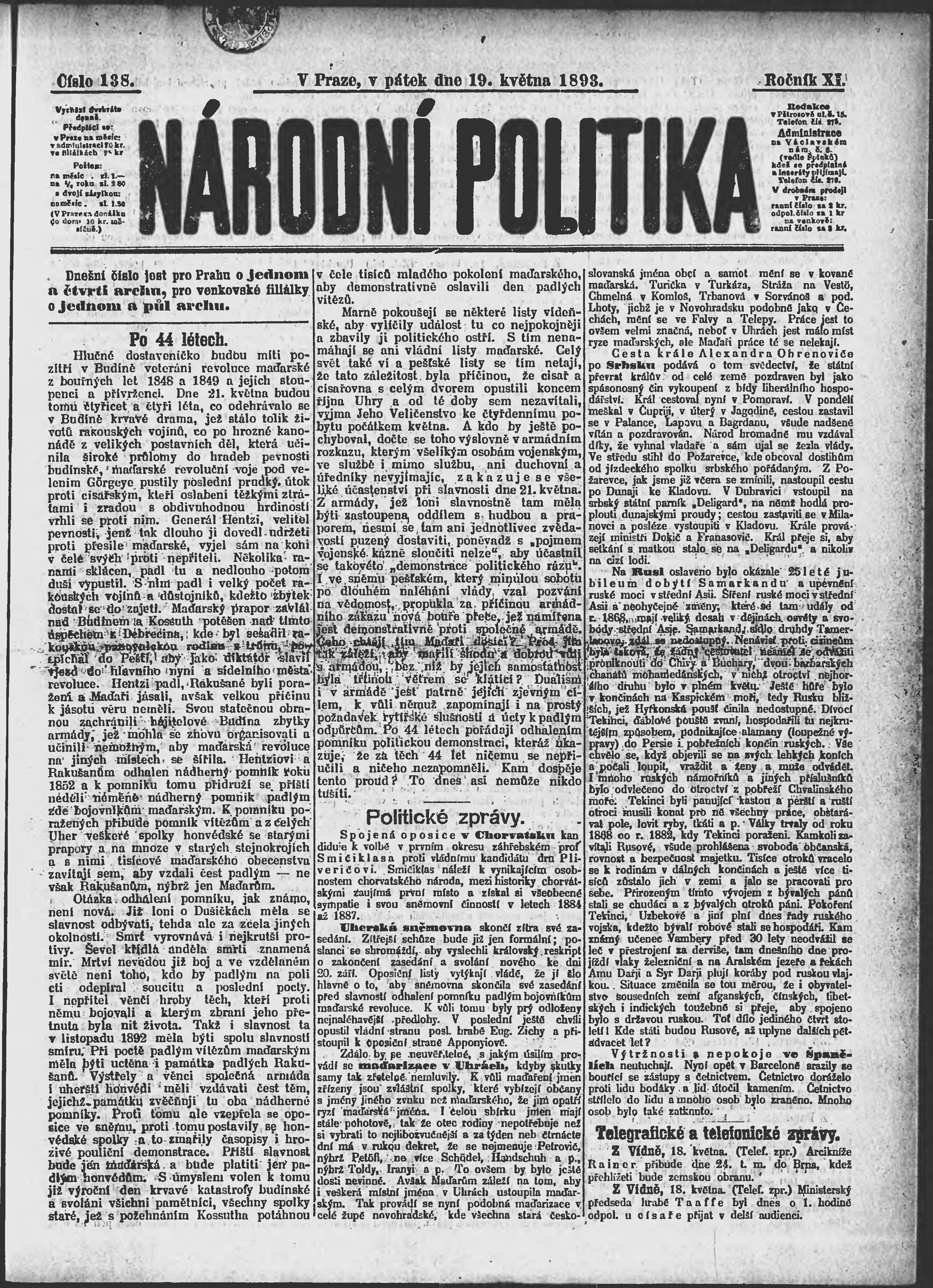 * Datum vydání výtisku: 19.5.1893 Číslo výtisku: 138 Poznámky k výtisku: ranní vydání;