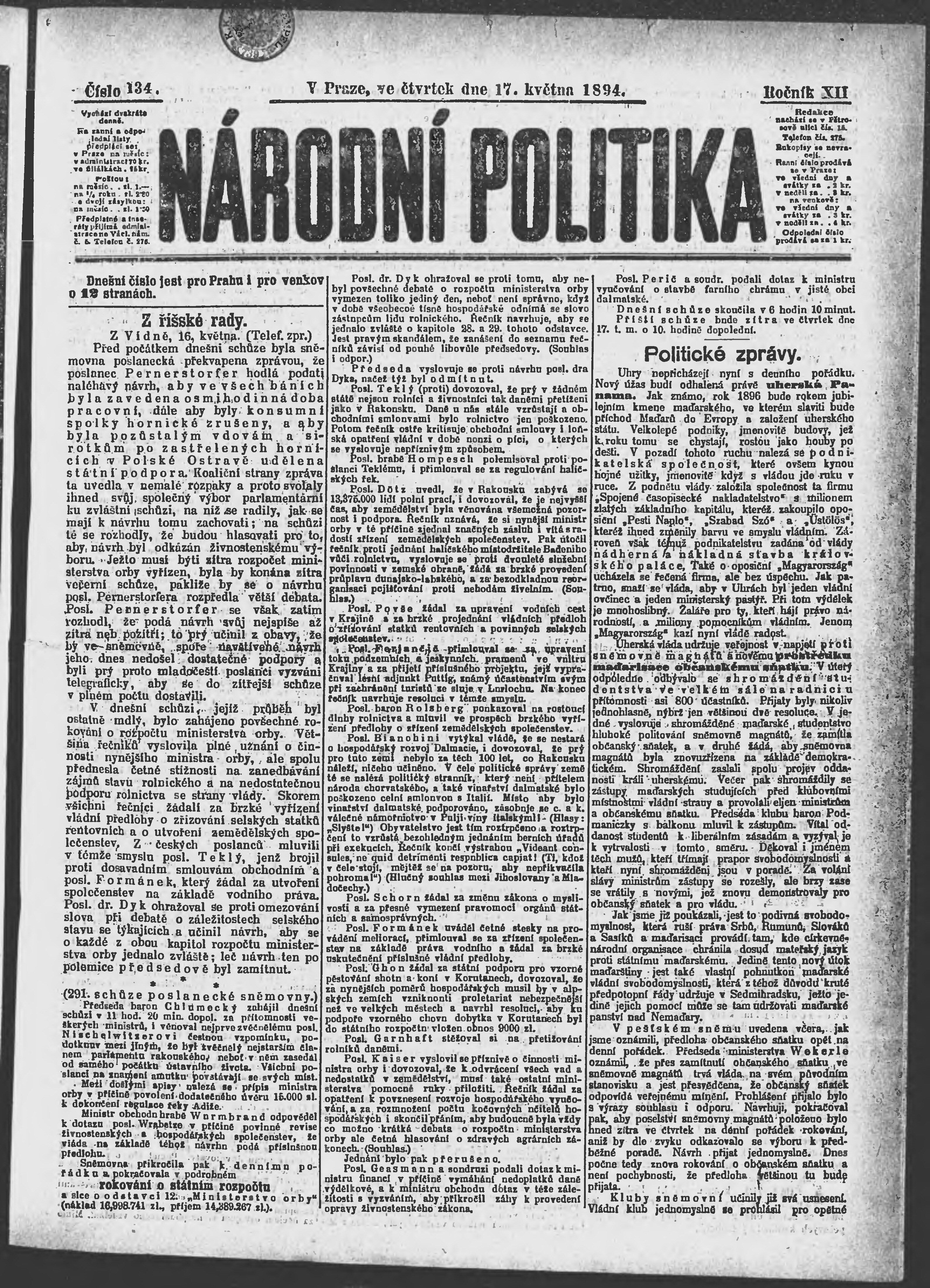 * Datum vydání výtisku: 17.5.1894 Číslo výtisku: 134 Poznámky k výtisku: ranní vydání;