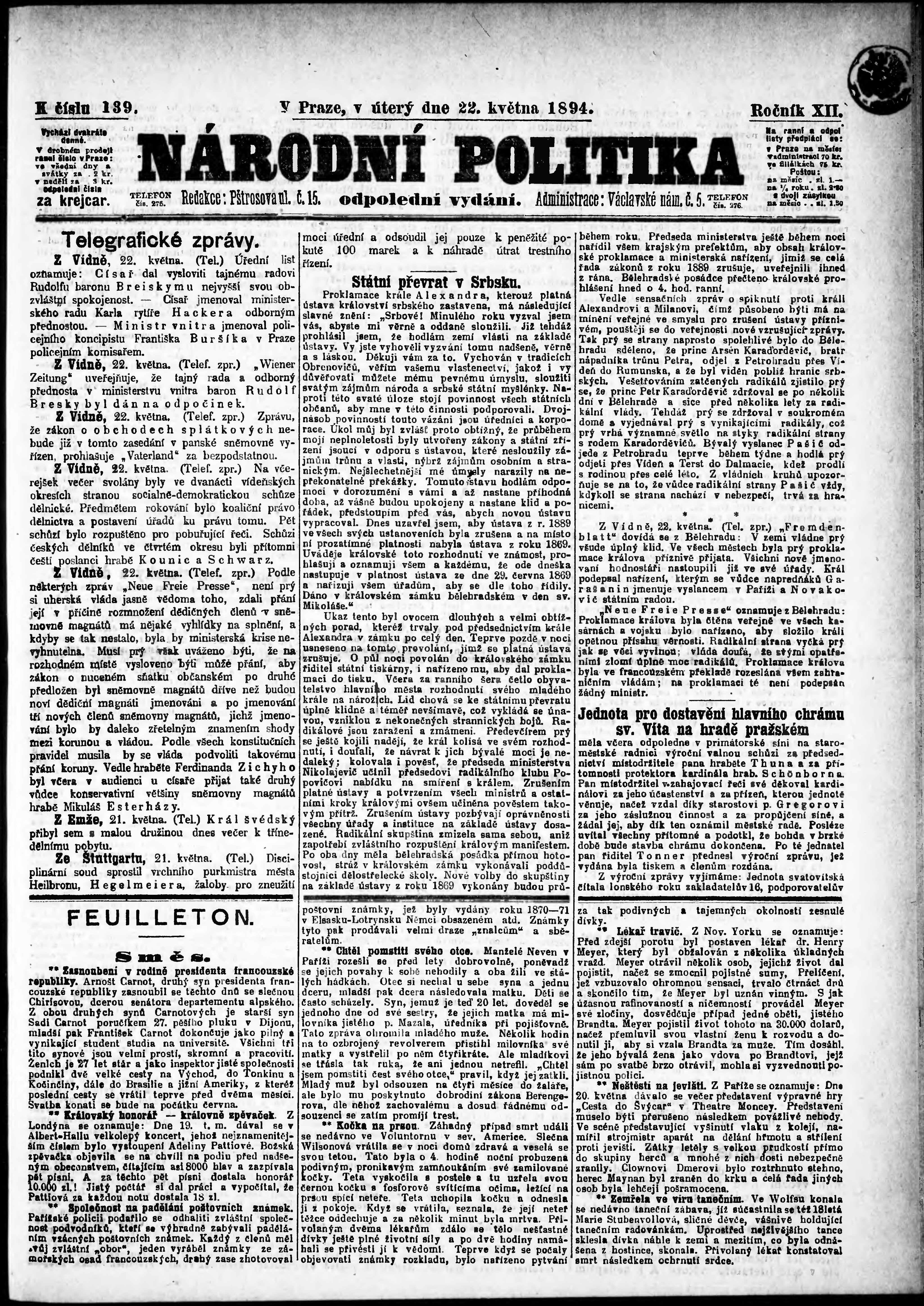 * Datum vydání výtisku: 22.5.1894 Číslo výtisku: 139 Poznámky k výtisku: odpolední vydání;