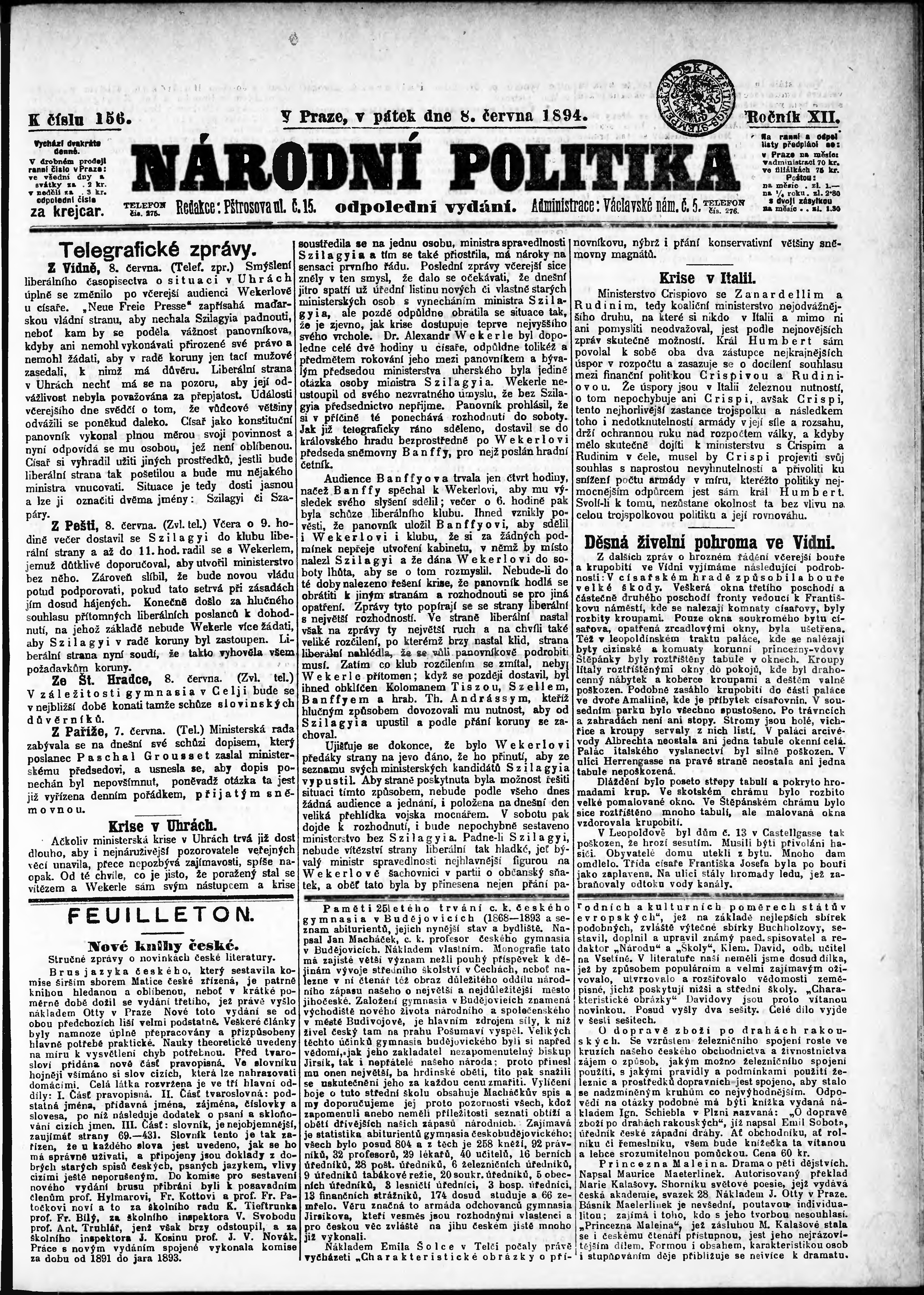 * Datum vydání výtisku: 8.6.1894 Číslo výtisku: 156 Poznámky k výtisku: odpolední vydání;