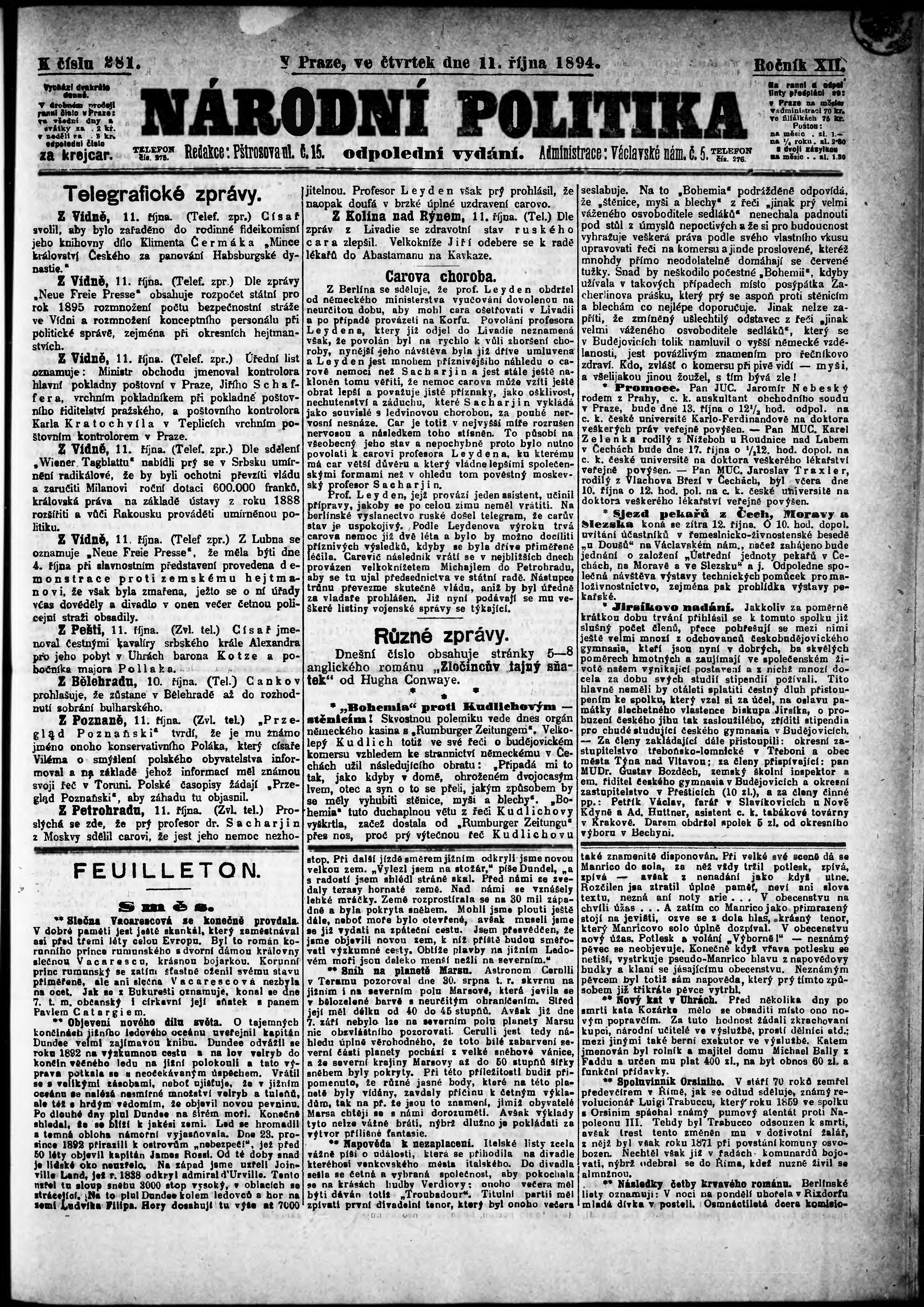 * Datum vydání výtisku: 11.10.1894 Číslo výtisku: 281 Poznámky k výtisku: odpolední vydání;
