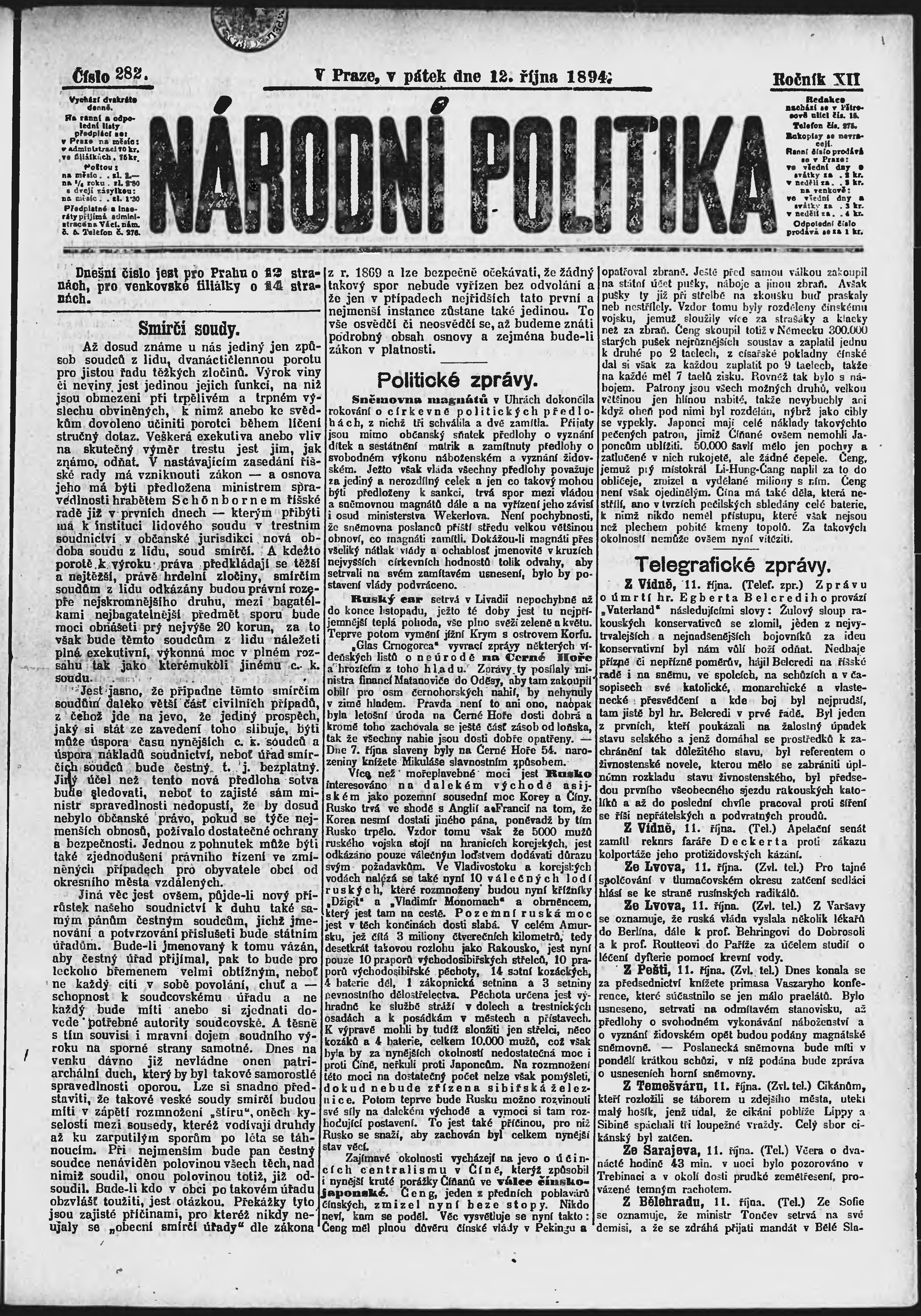 * Datum vydání výtisku: 12.10.1894 Číslo výtisku: 282 Poznámky k výtisku: ranní vydání;