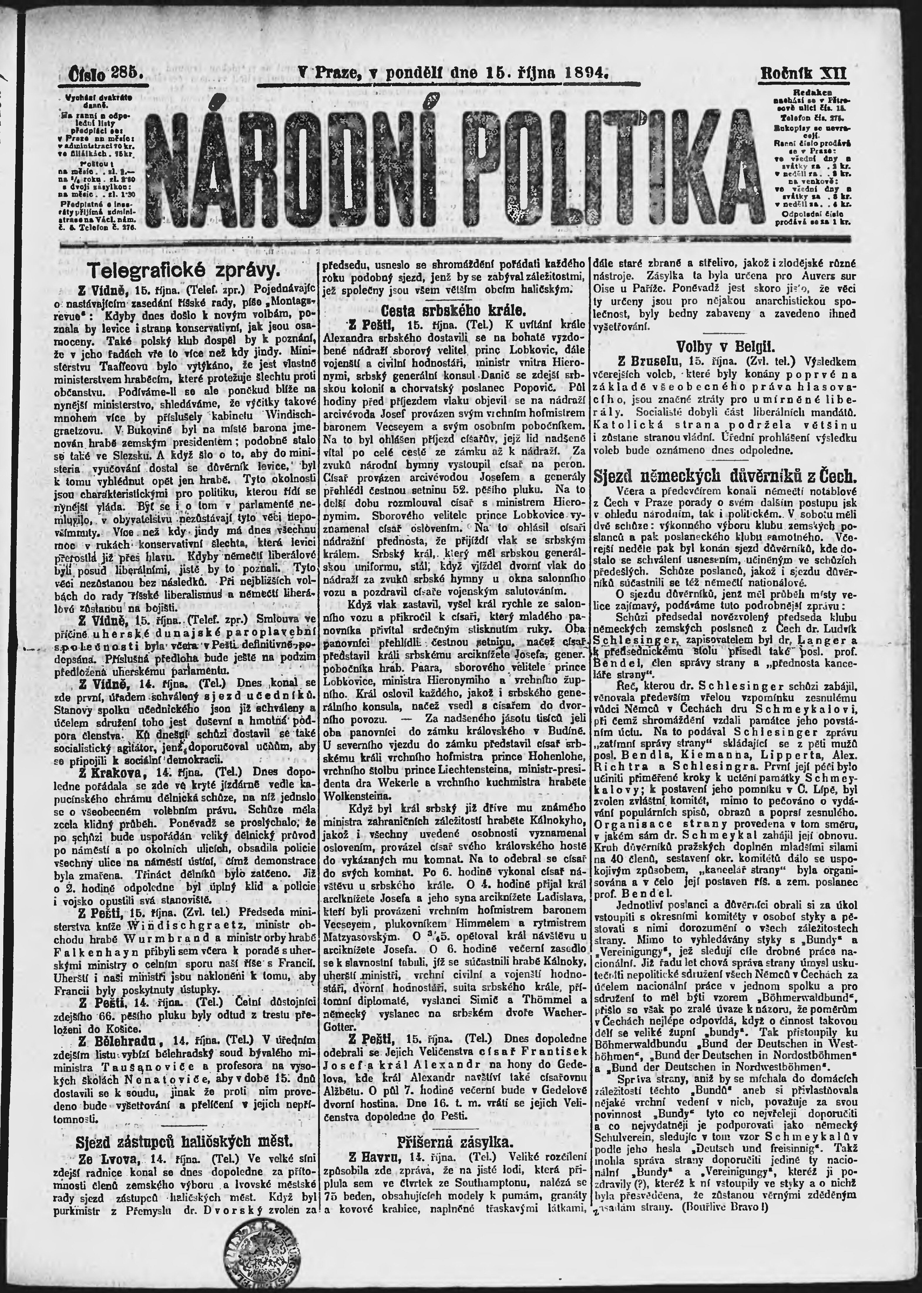 * Datum vydání výtisku: 15.10.1894 Číslo výtisku: 285 Poznámky k výtisku: ranní vydání;