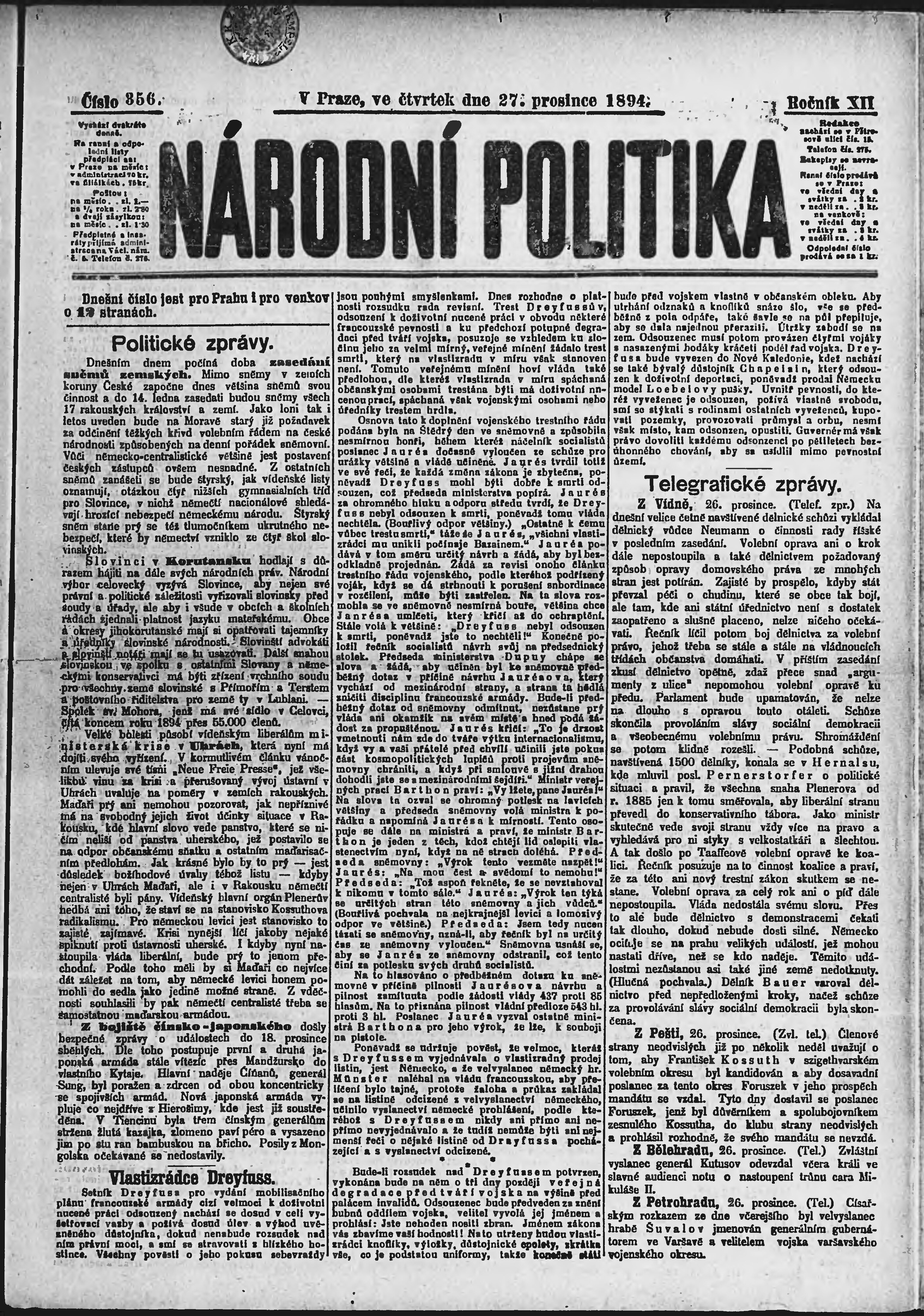 * Datum vydání výtisku: 27.12.1894 Číslo výtisku: 356 Poznámky k výtisku: ranní vydání;