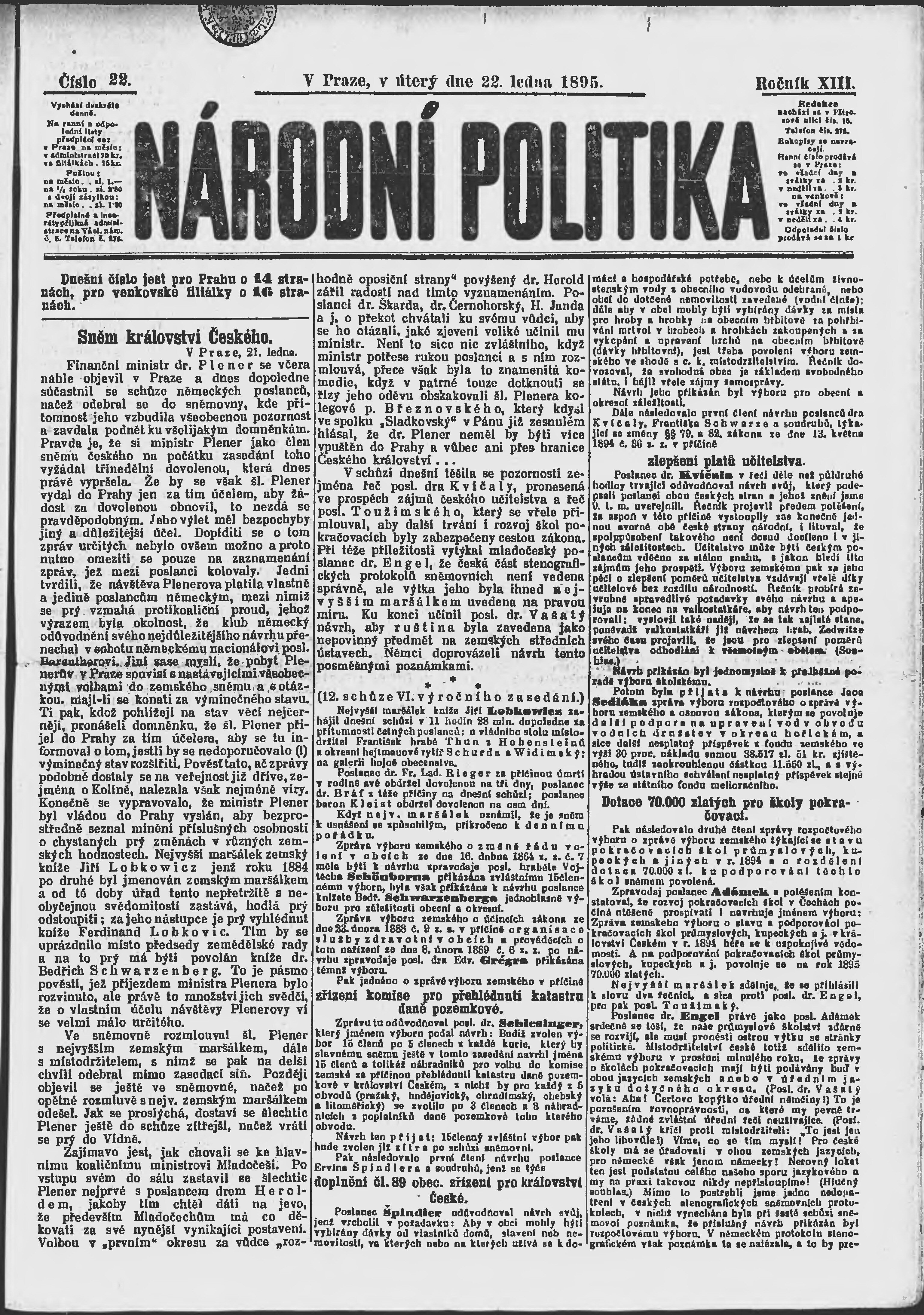* Datum vydání výtisku: 22.1.1895 Číslo výtisku: 22 Poznámky k výtisku: ranní vydání;