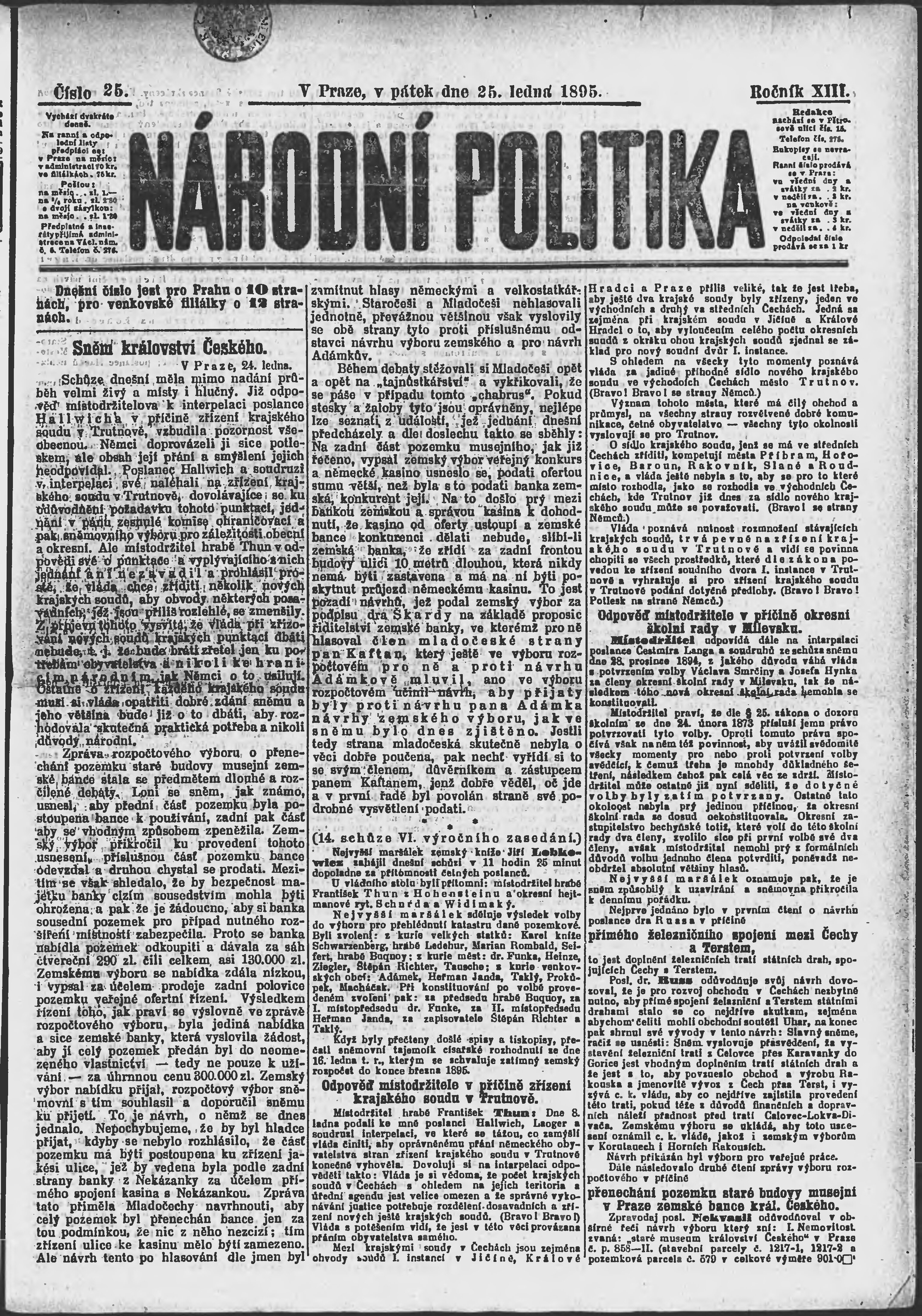 * Datum vydání výtisku: 25.1.1895 Číslo výtisku: 25 Poznámky k výtisku: ranní vydání;