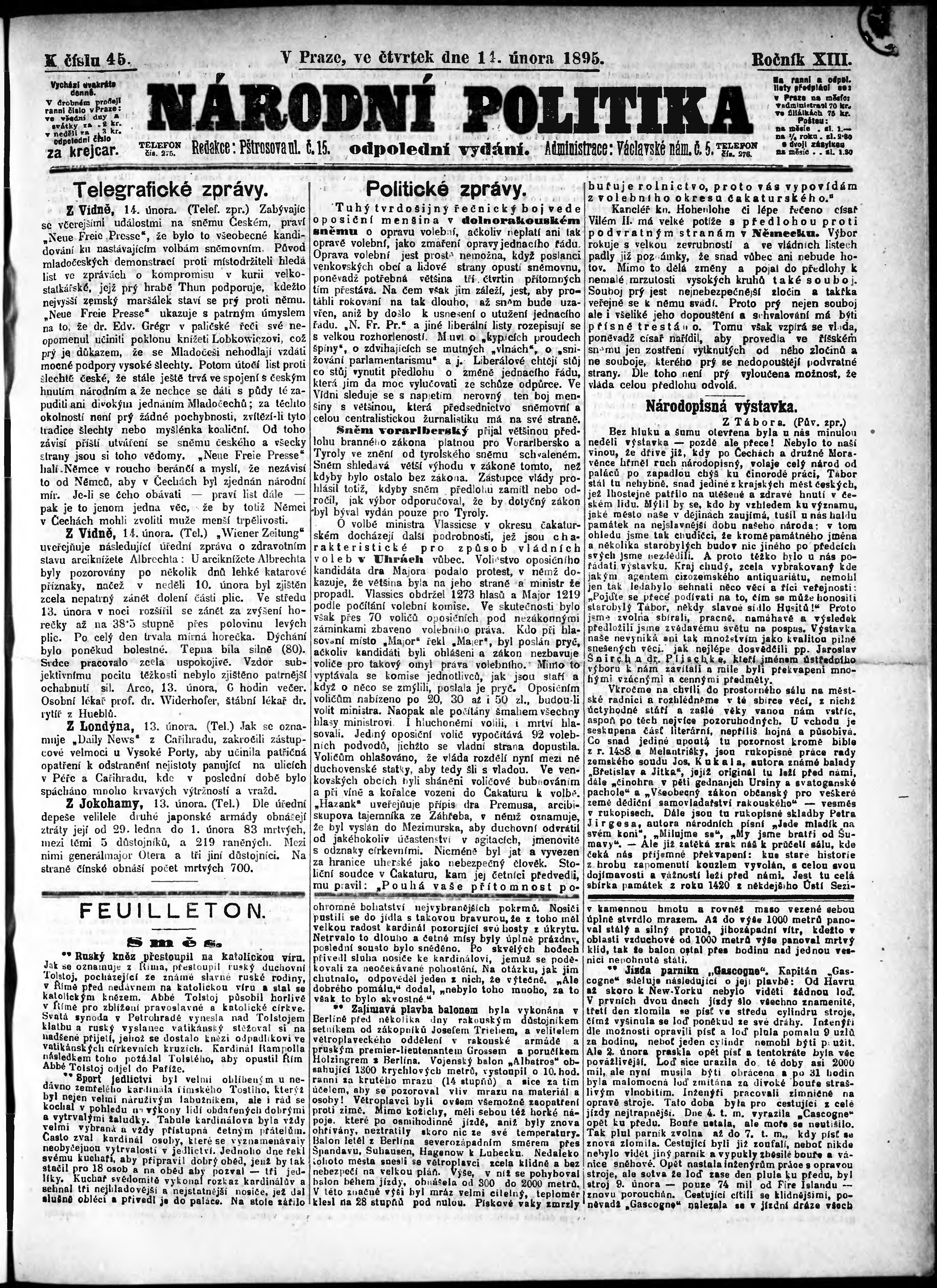 * Datum vydání výtisku: 14.2.1895 Číslo výtisku: 45 Poznámky k výtisku: odpolední vydání;