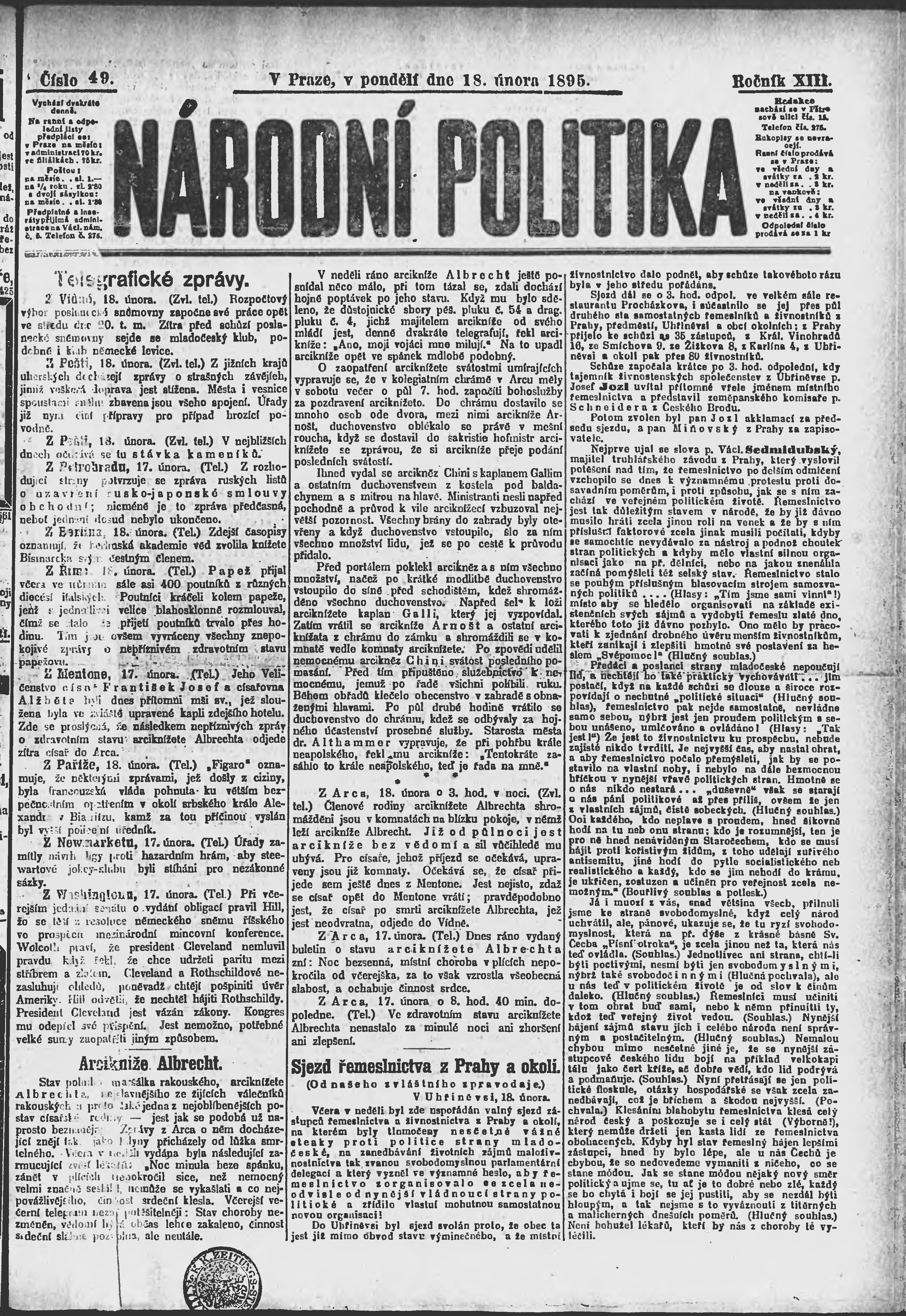 * Datum vydání výtisku: 18.2.1895 Číslo výtisku: 49 Poznámky k výtisku: ranní vydání;