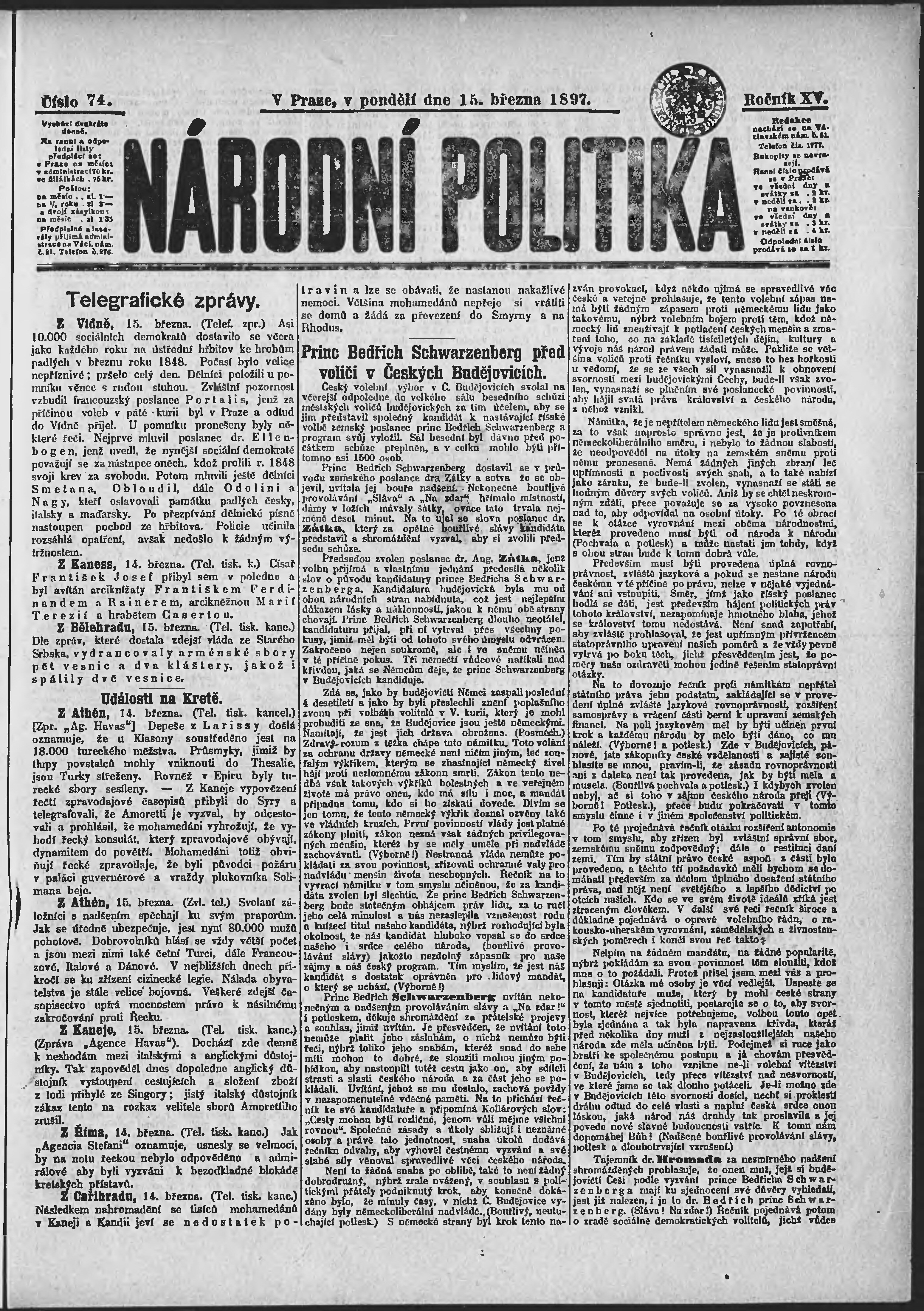 * Datum vydání výtisku: 15.3.1897 Číslo výtisku: 74 Poznámky k výtisku: ranní vydání;