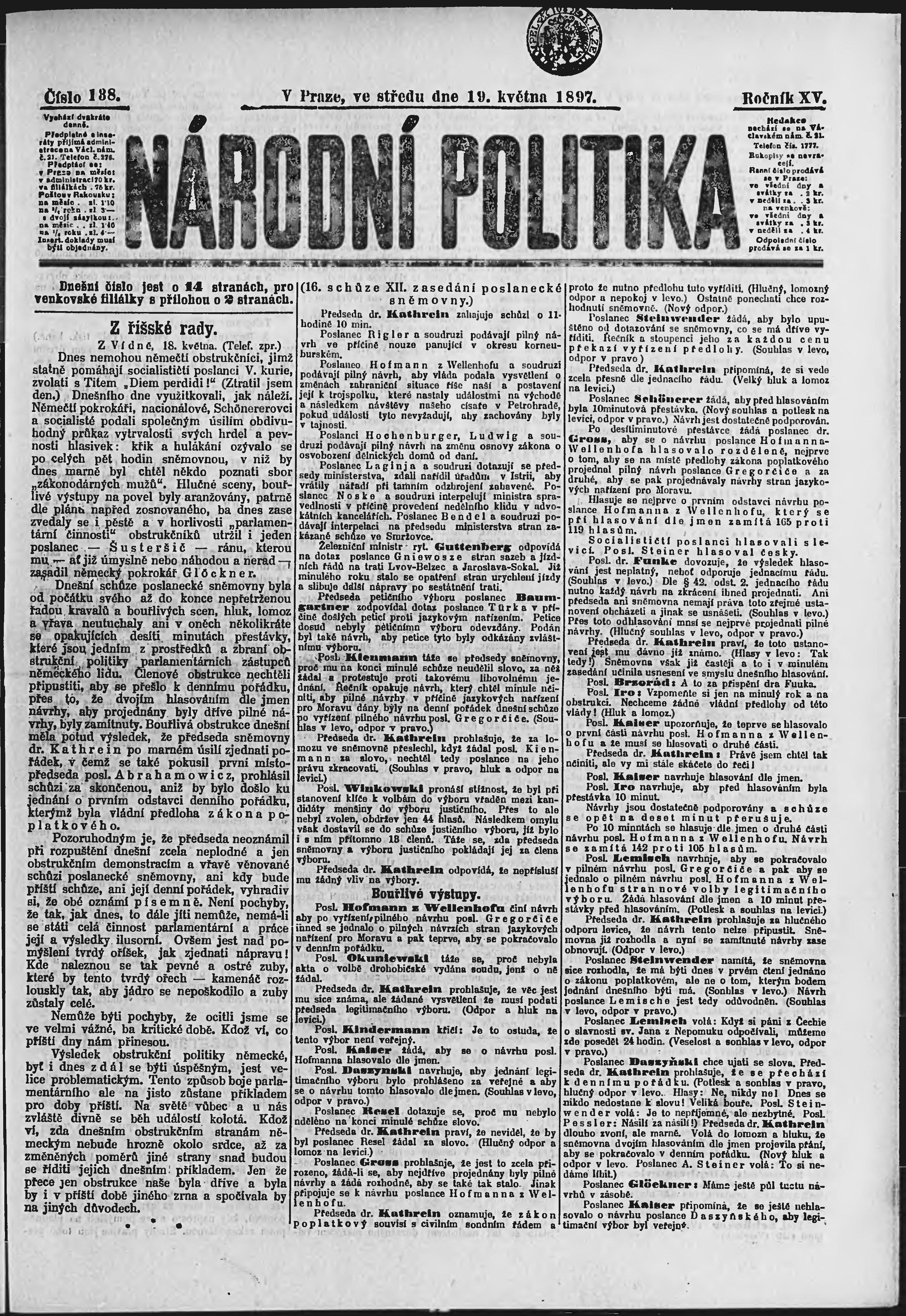 * Datum vydání výtisku: 19.5.1897 Číslo výtisku: 138 Poznámky k výtisku: ranní vydání;