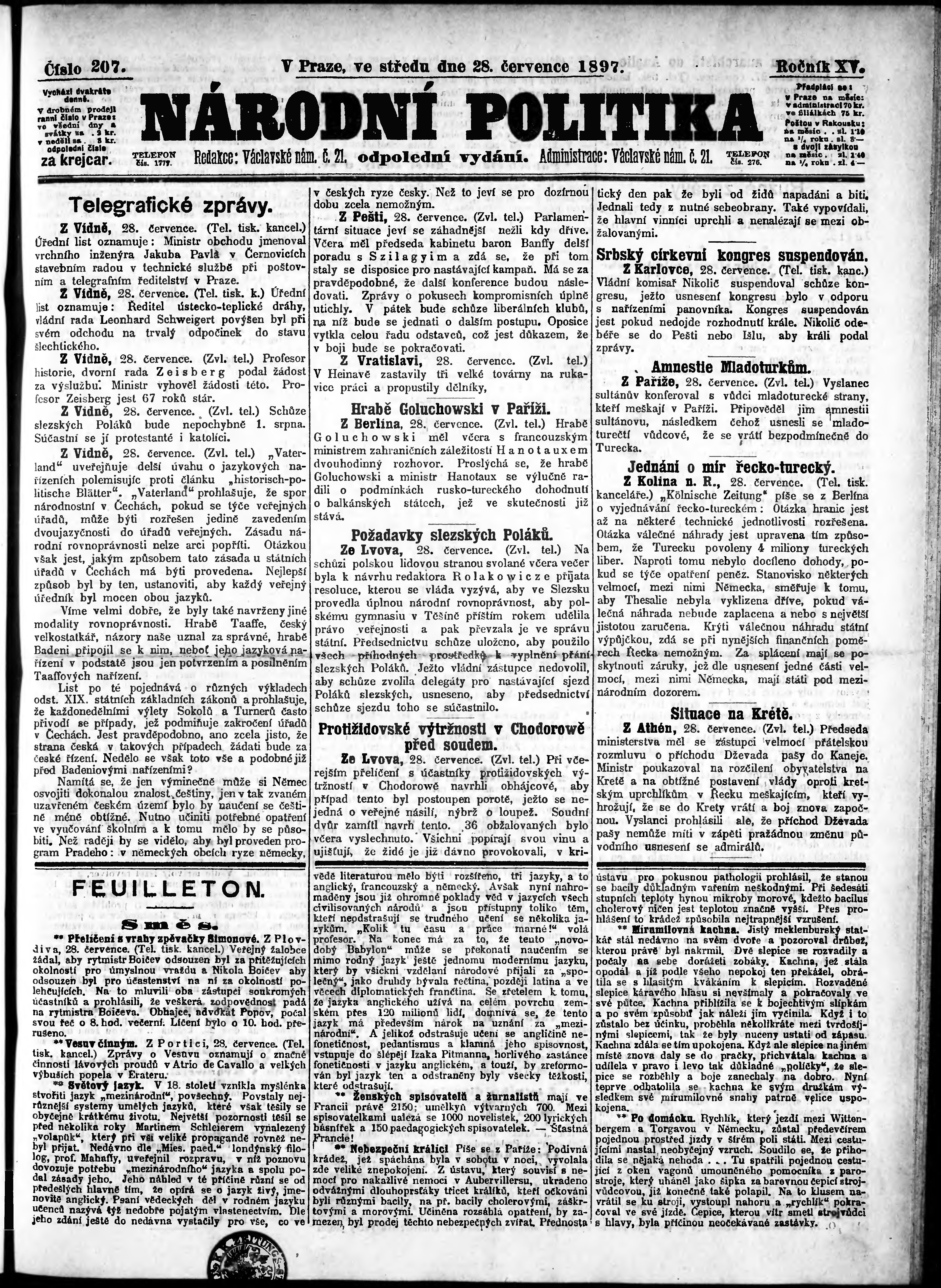 * Datum vydání výtisku: 28.7.1897 Číslo výtisku: 207 Poznámky k výtisku: odpolední vydání;