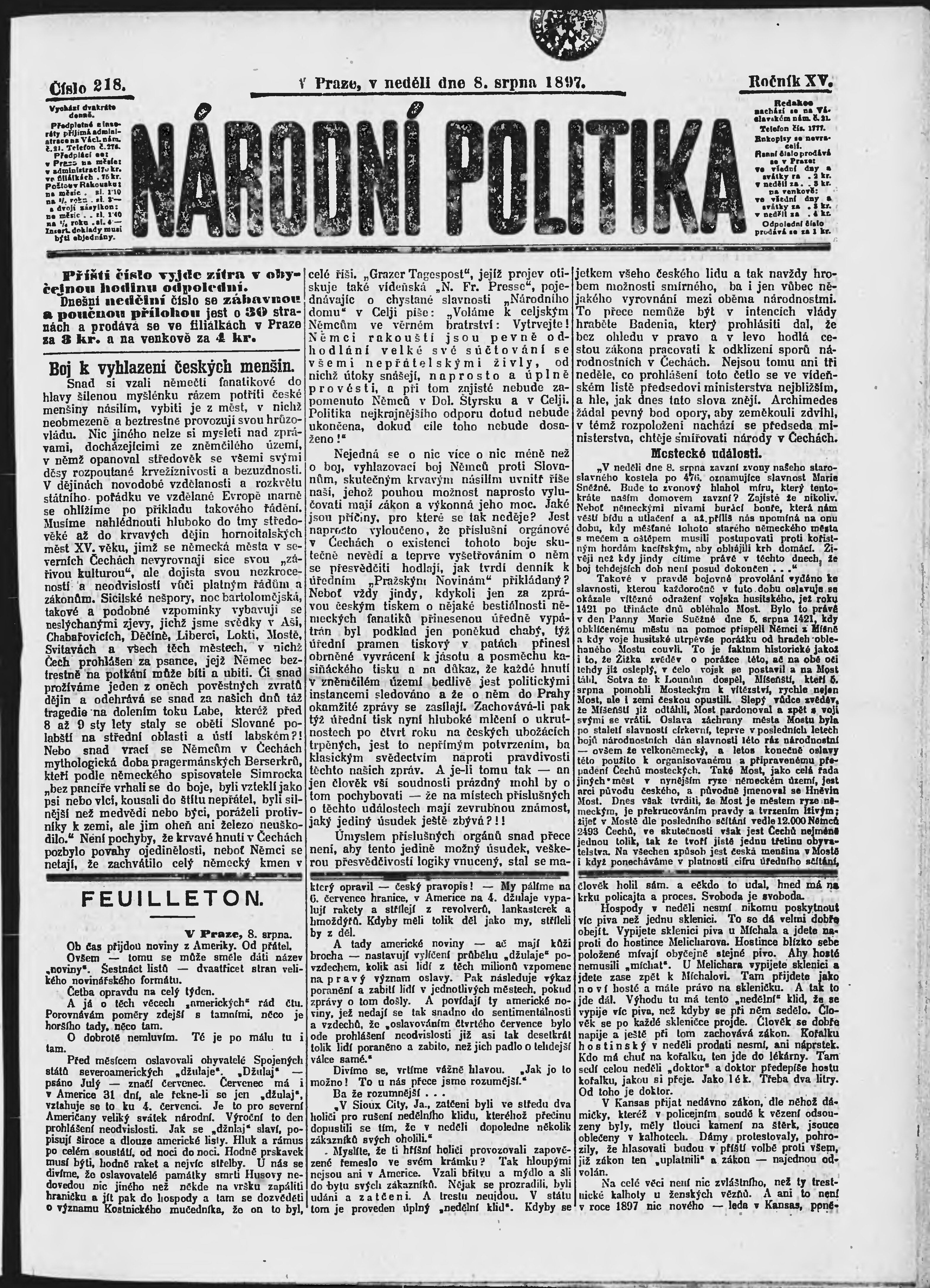 * Datum vydání výtisku: 8.8.1897 Číslo výtisku: 218 Poznámky k výtisku: ranní vydání;