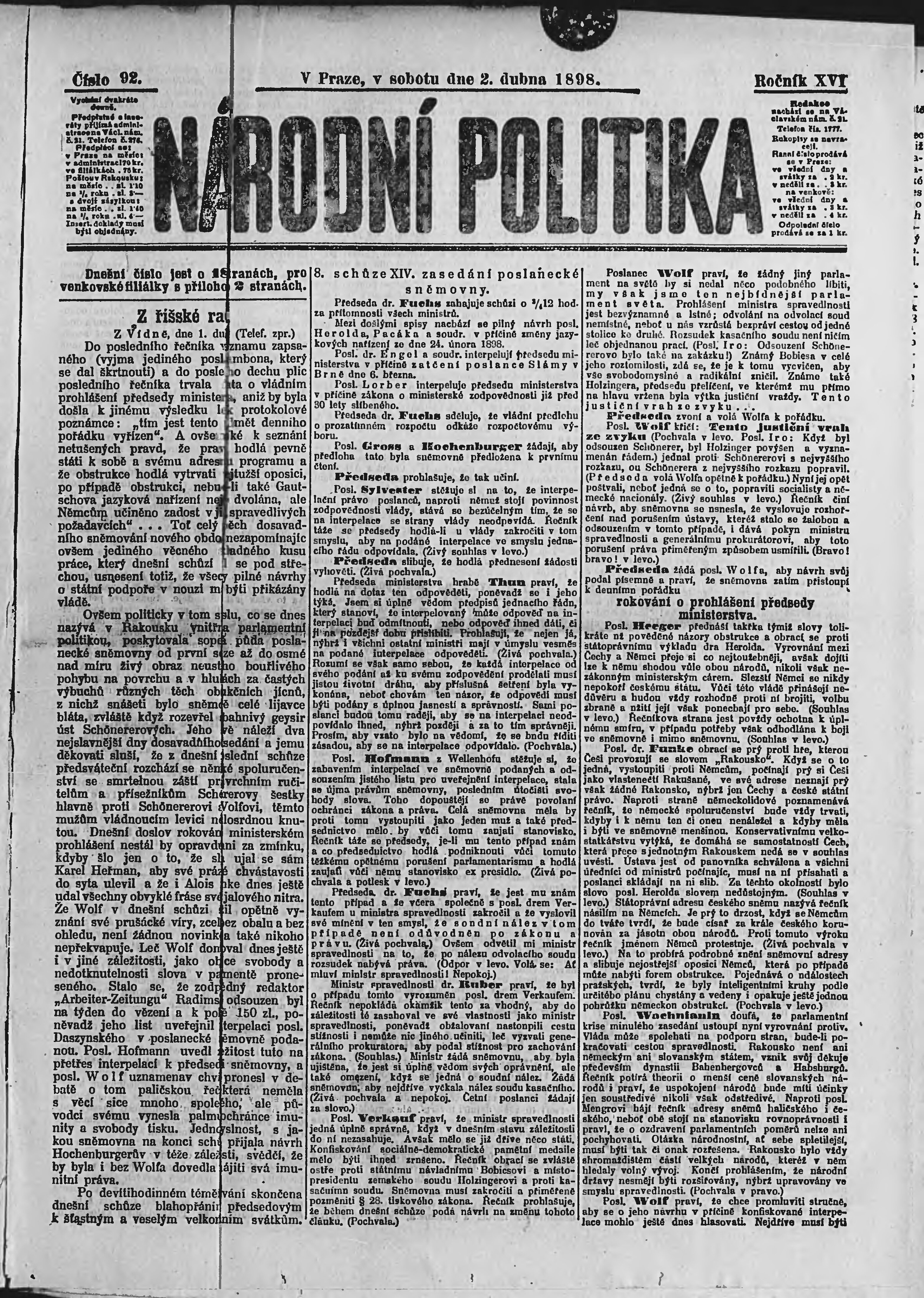 * Datum vydání výtisku: 2.4.1898 Číslo výtisku: 92 Poznámky k výtisku: ranní vydání;