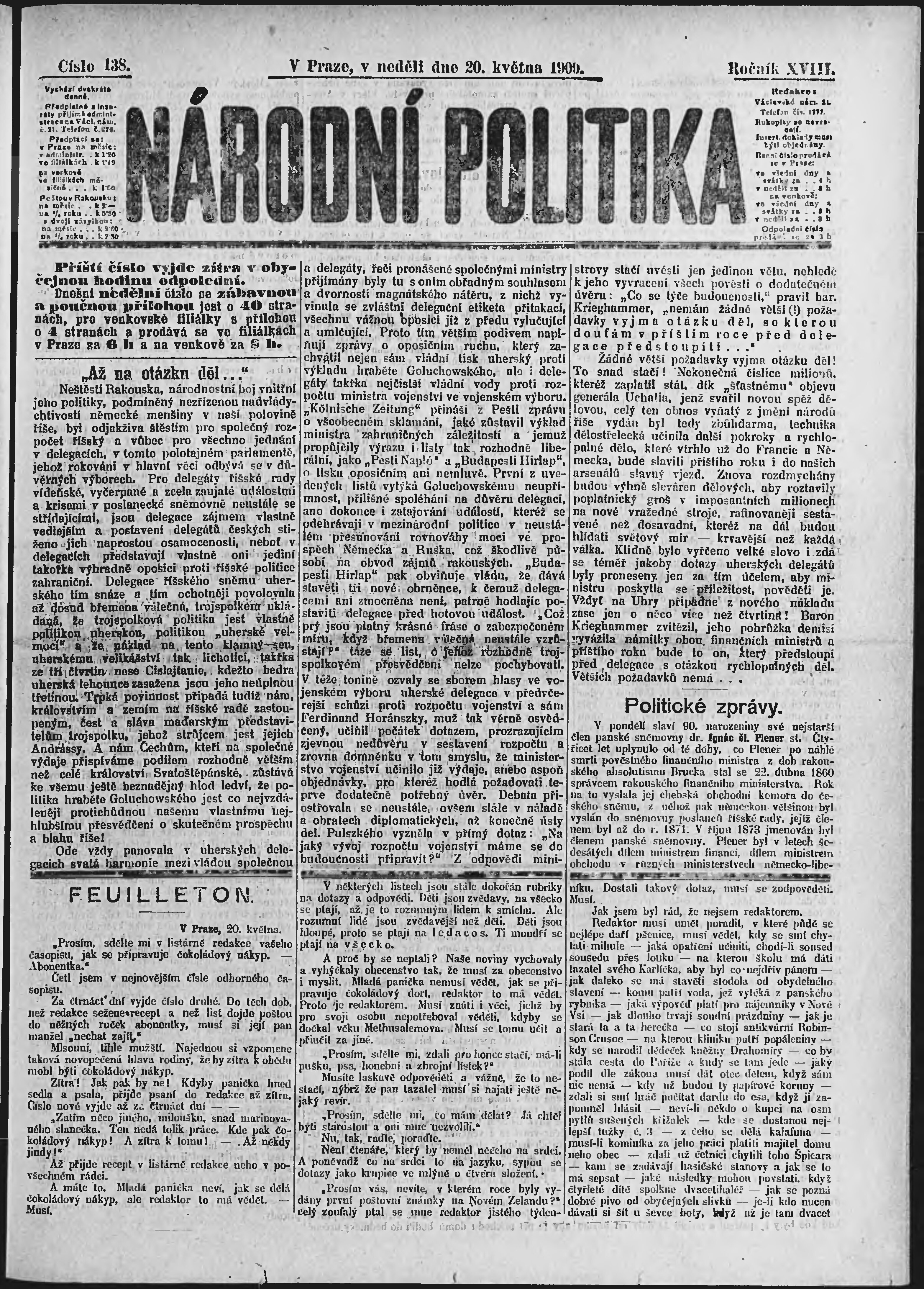 * Datum vydání výtisku: 20.5.1900 Číslo výtisku: 138 Poznámky k výtisku: ranní vydání;